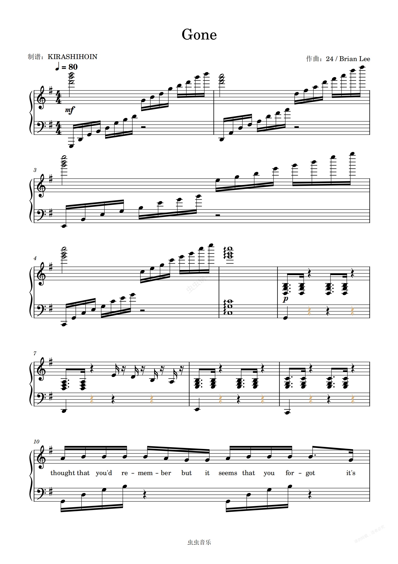 钢琴谱:GONE [G调] ROSÉ