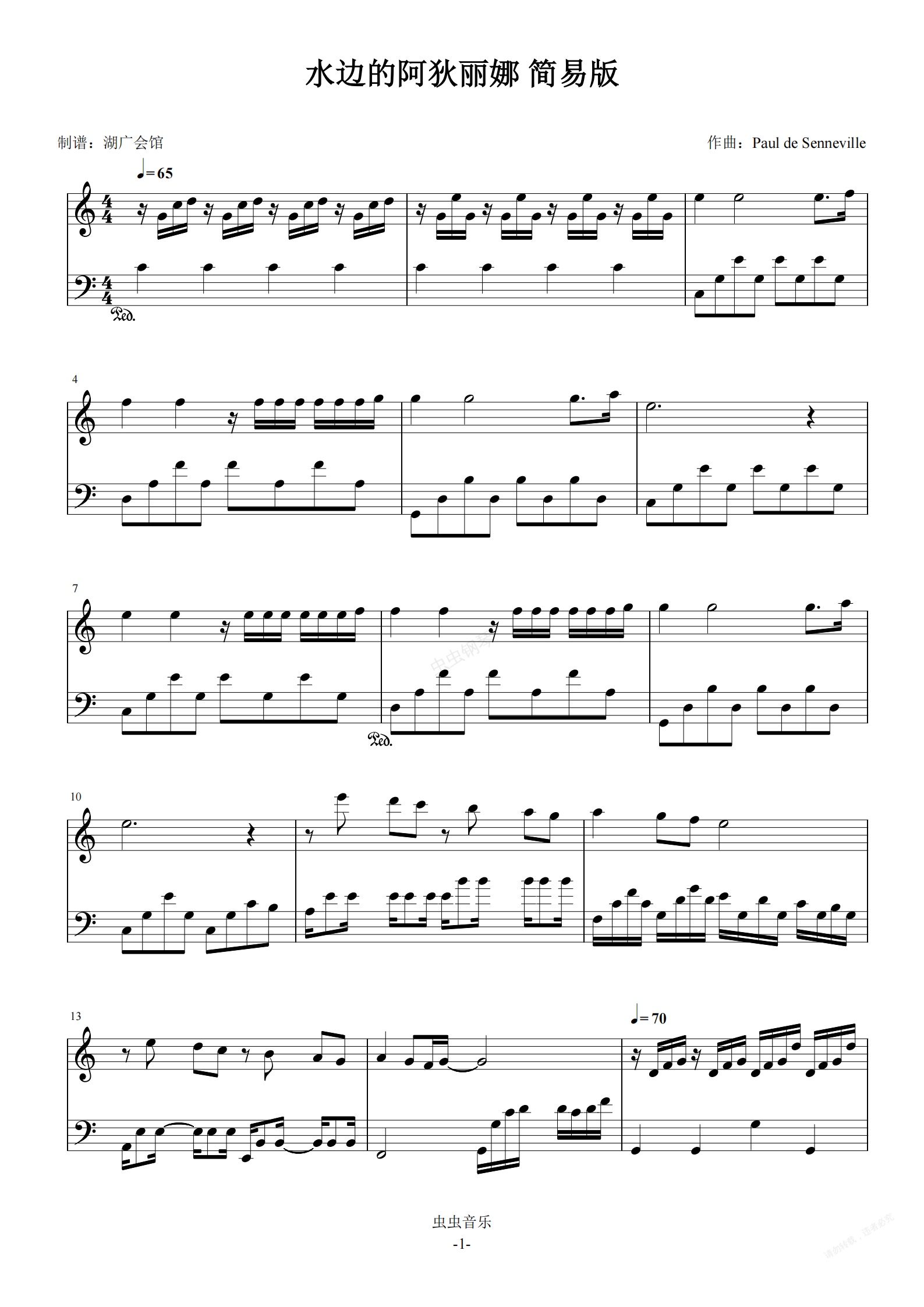 钢琴谱:水边的阿狄丽娜 C调简易  容易上手容易弹