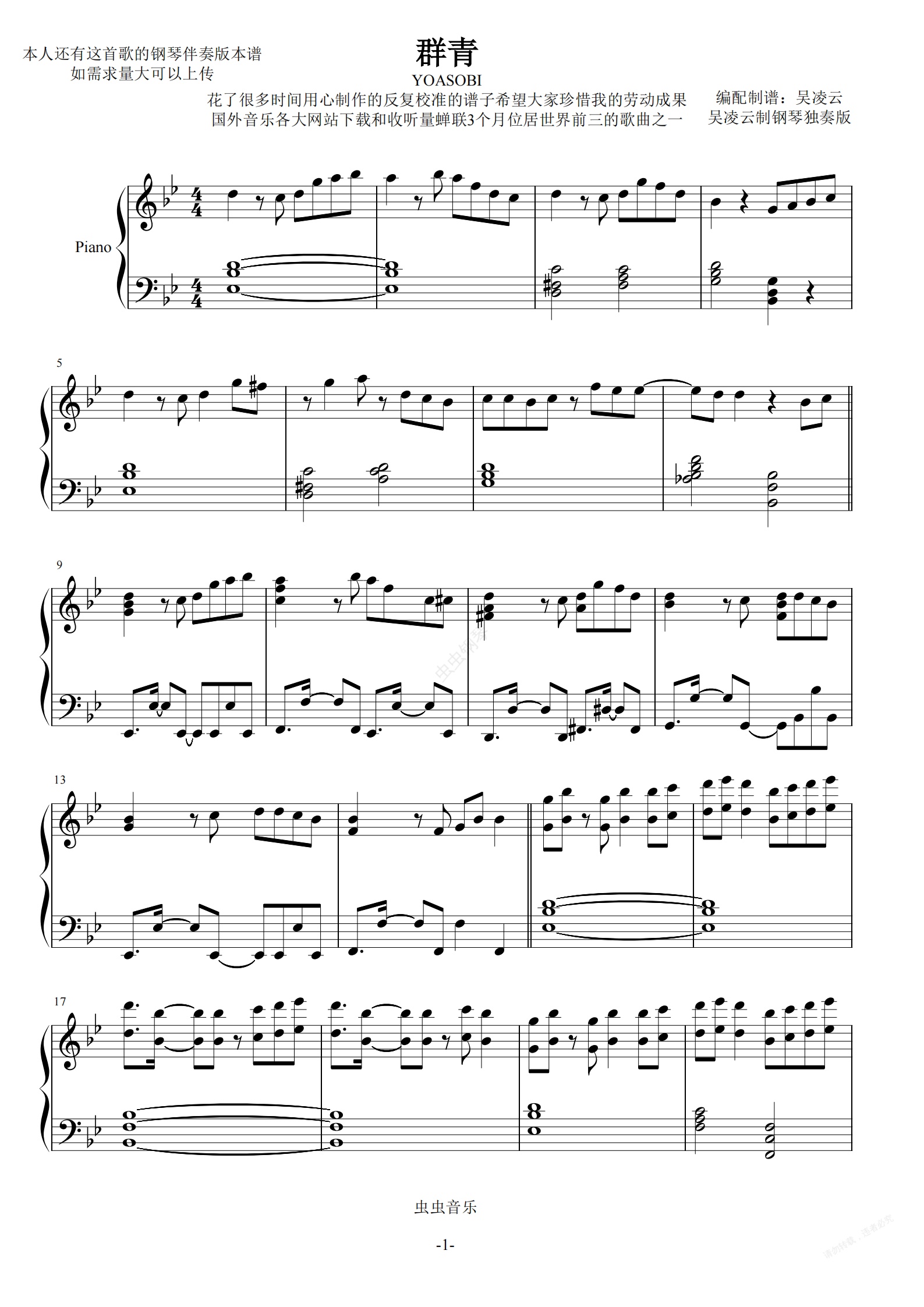 钢琴谱:群青 YOASOBI 完美精致演奏版 吴凌云制钢琴独奏版