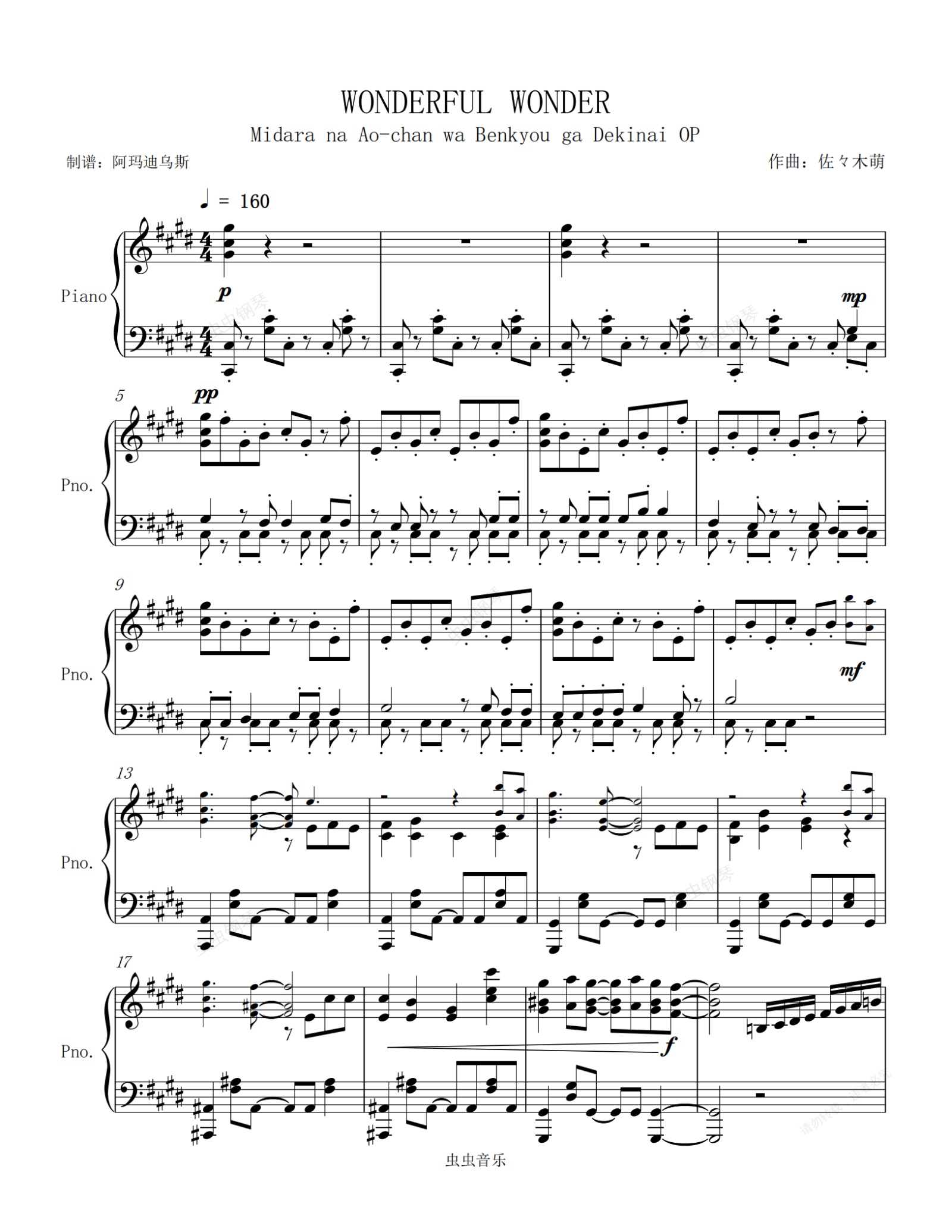 钢琴谱:YL的青酱不能学习 OP < WONDERFUL WONDER > 原调高还原完整版本