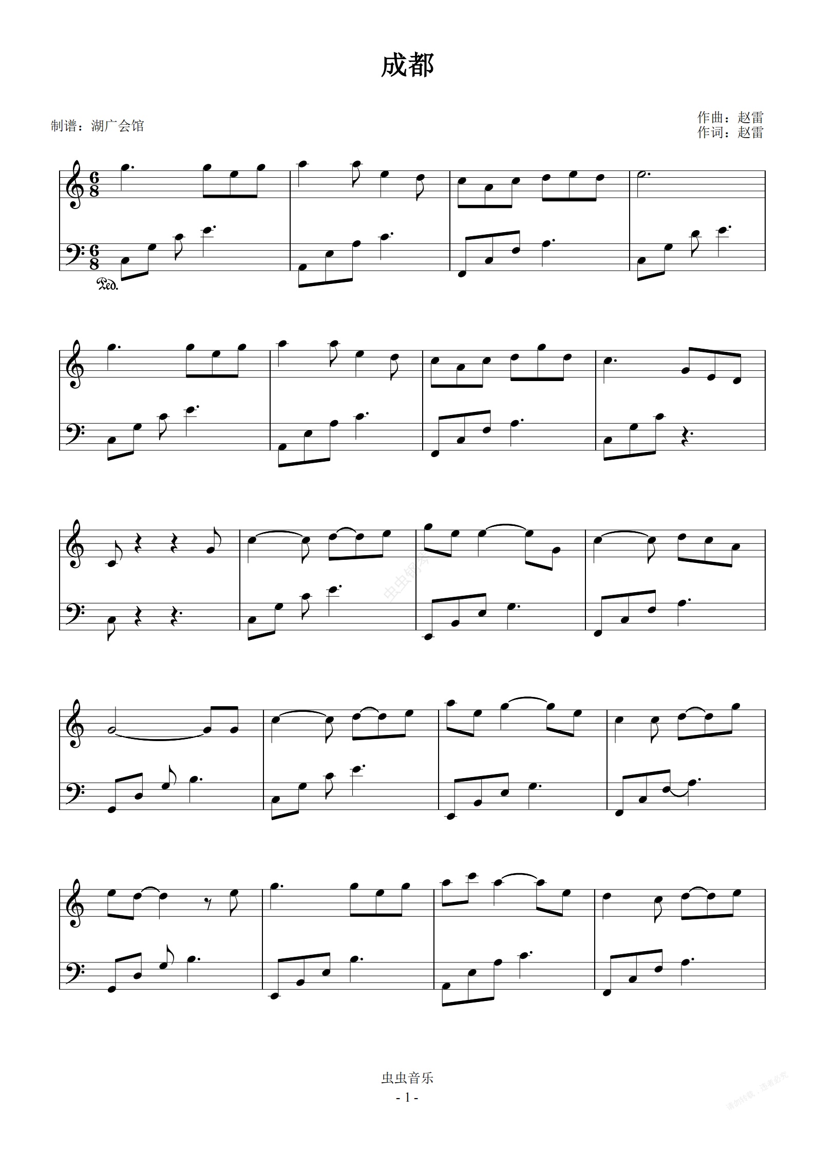 钢琴谱:成都 赵雷 C调简易容易弹
