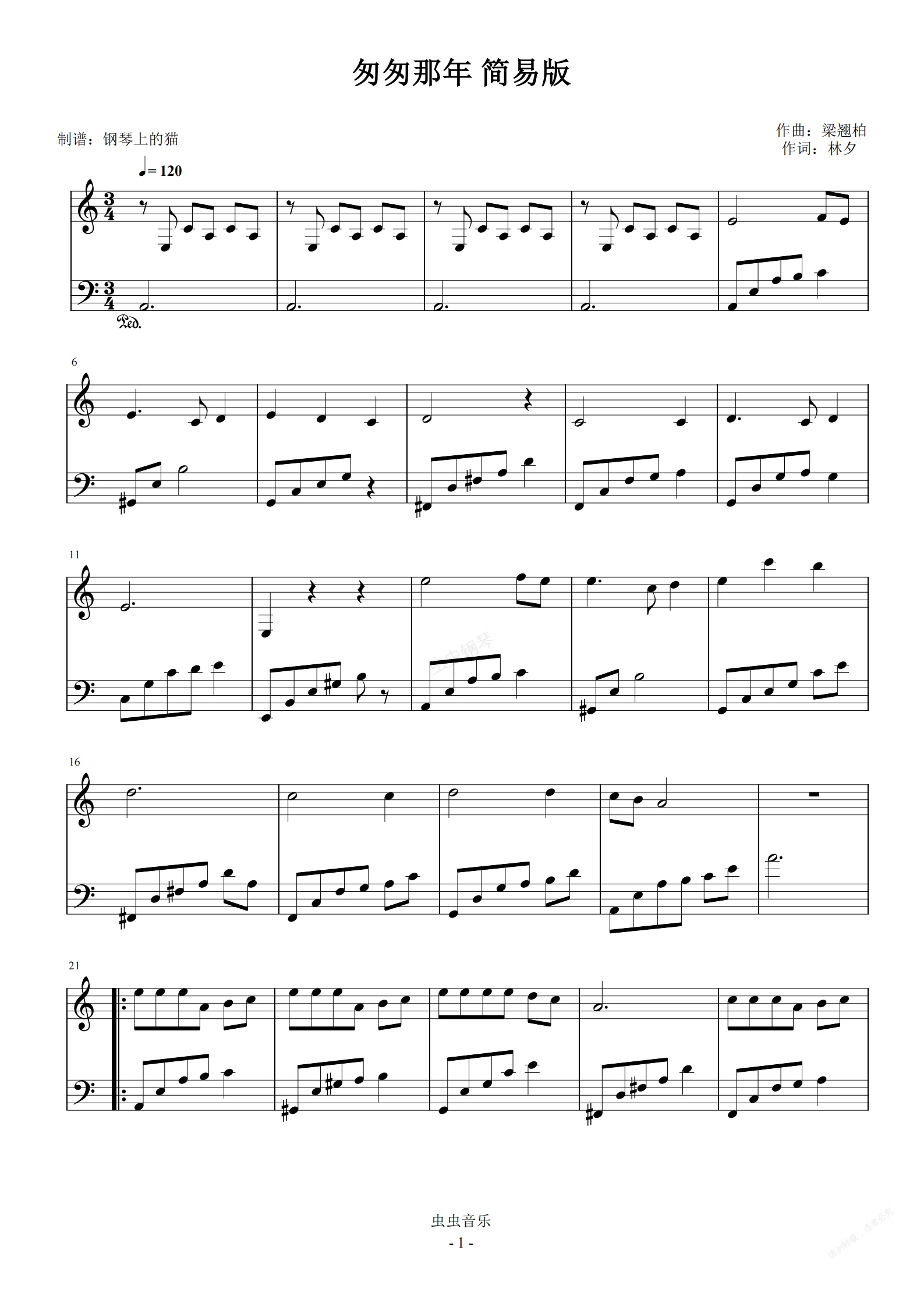 钢琴谱:匆匆那年 C调简易版容易弹