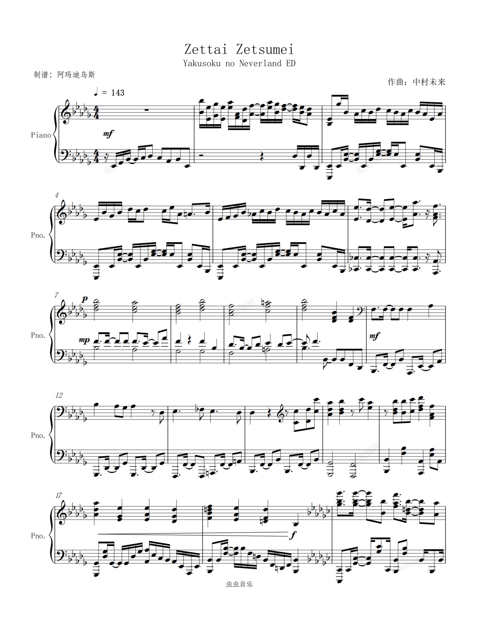 钢琴谱:约定的梦幻岛 ED < 絶体絶命 > 原调高还原完整版本