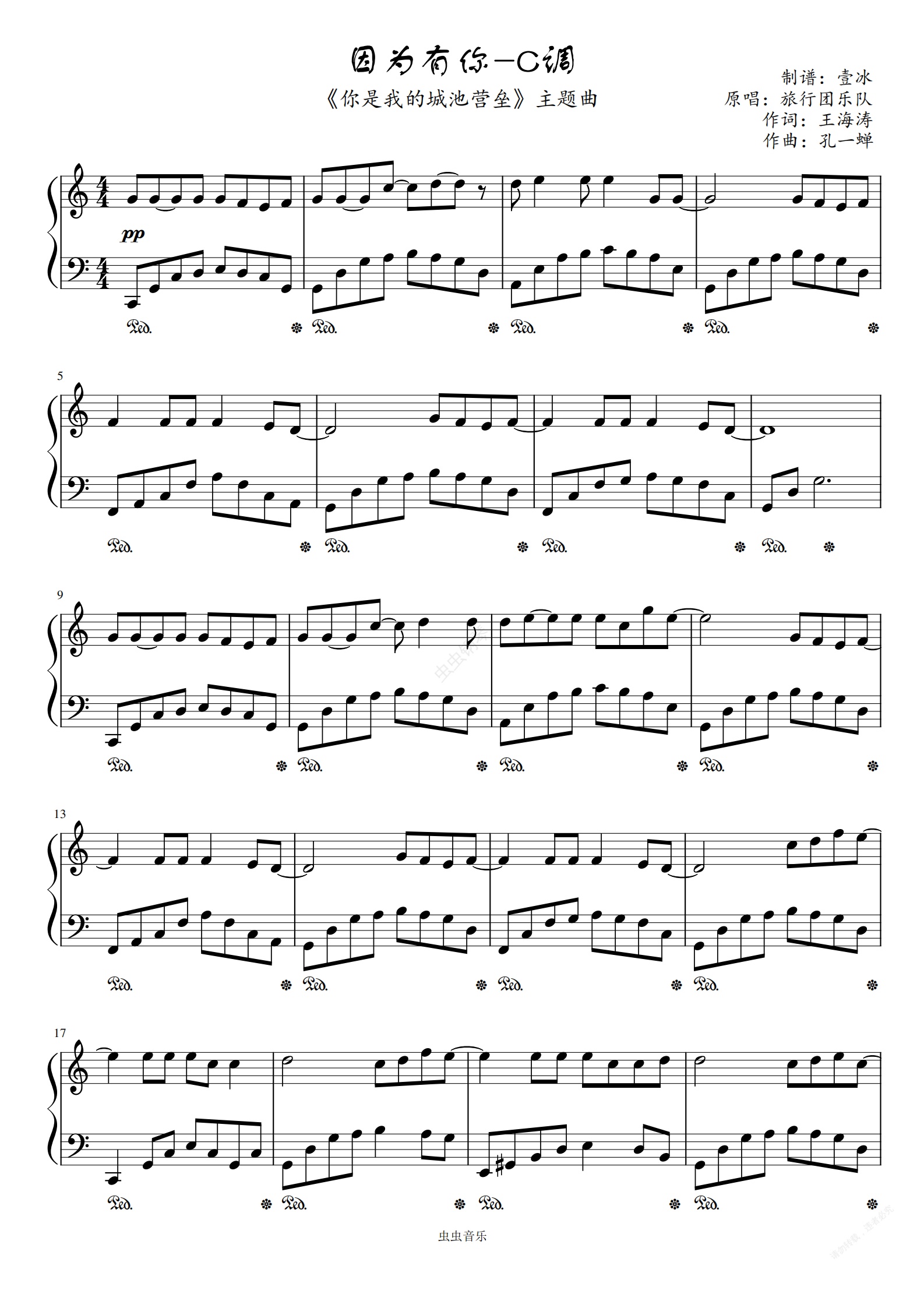 钢琴谱:因为有你//《你是我的城池营垒》主题曲-C调简单易上手
