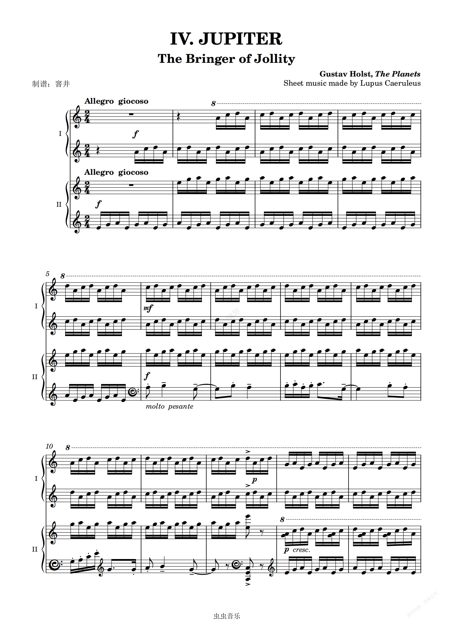 这首双钢琴版本也是霍尔斯特自己改编的,它的完成时间实际上早于交响乐版本的发表,因此最开始很可能是霍尔斯特在创作时打的“草稿”。整体上难度并不算大,但整体效果非常好,个人十分推荐;在重制乐谱的时候尽量保留了原谱的风格,使用了19世纪流行的螺旋形低音谱号,以及保留了第17段(排练记号)处断开的小节,希望大家喜欢!