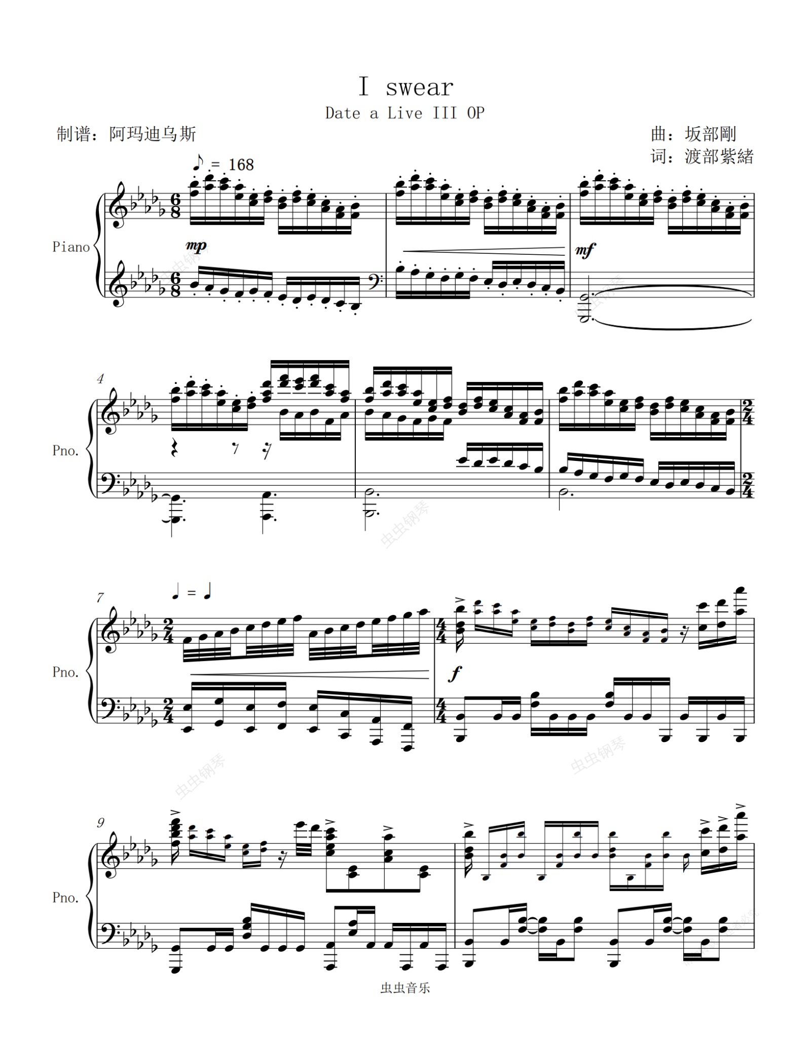 钢琴谱:约会大作战 OP < I swear > 原调高还原完整版本