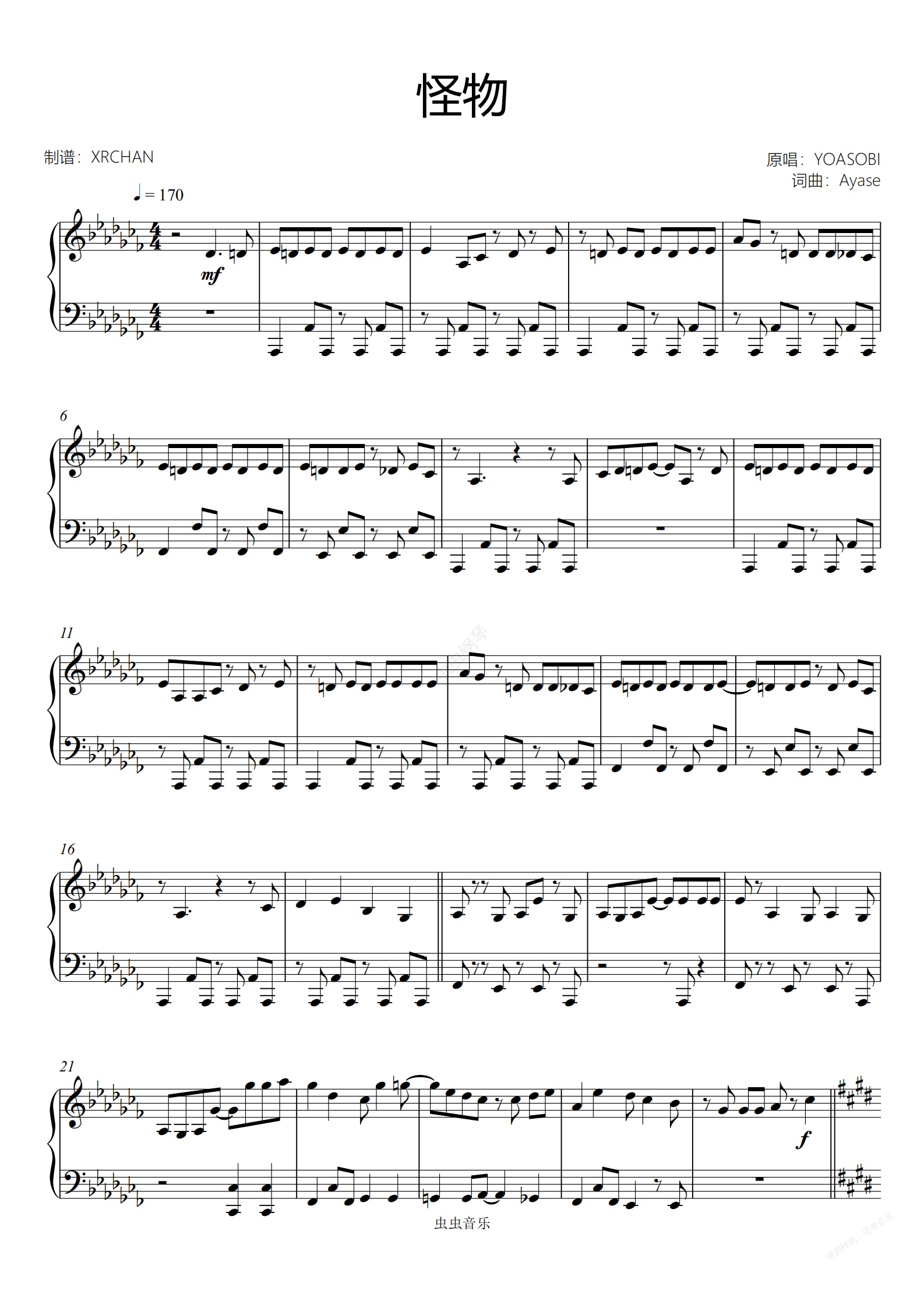 钢琴谱:YOASOBI「怪物」BEASTARS动物狂想曲第二季 OP