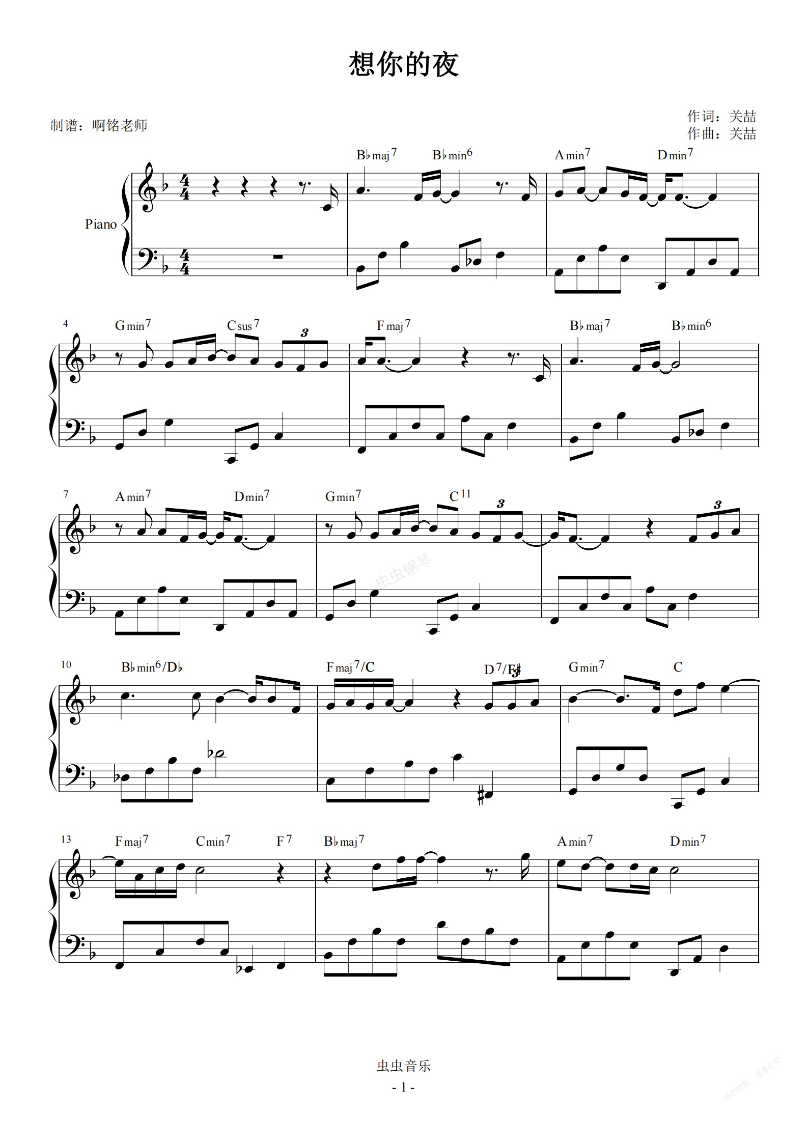 钢琴谱:想你的夜 F调简易 原版和弦