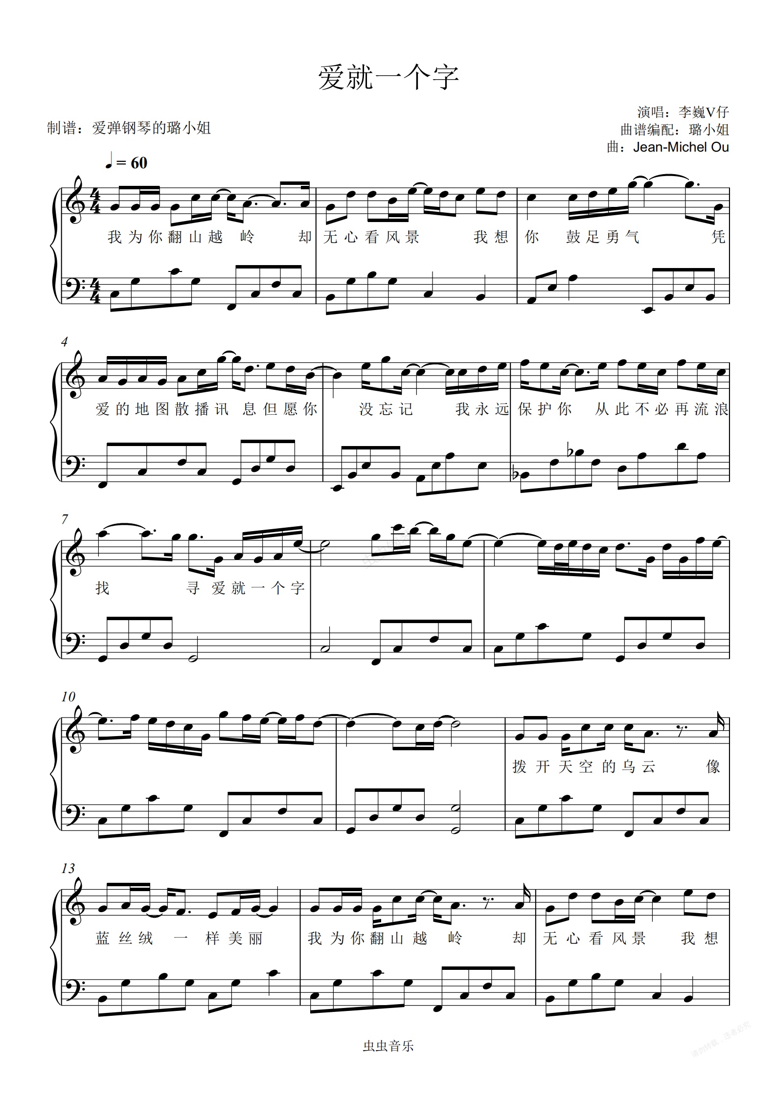 钢琴谱:爱就一个字 (李巍V仔版本)C调简单版