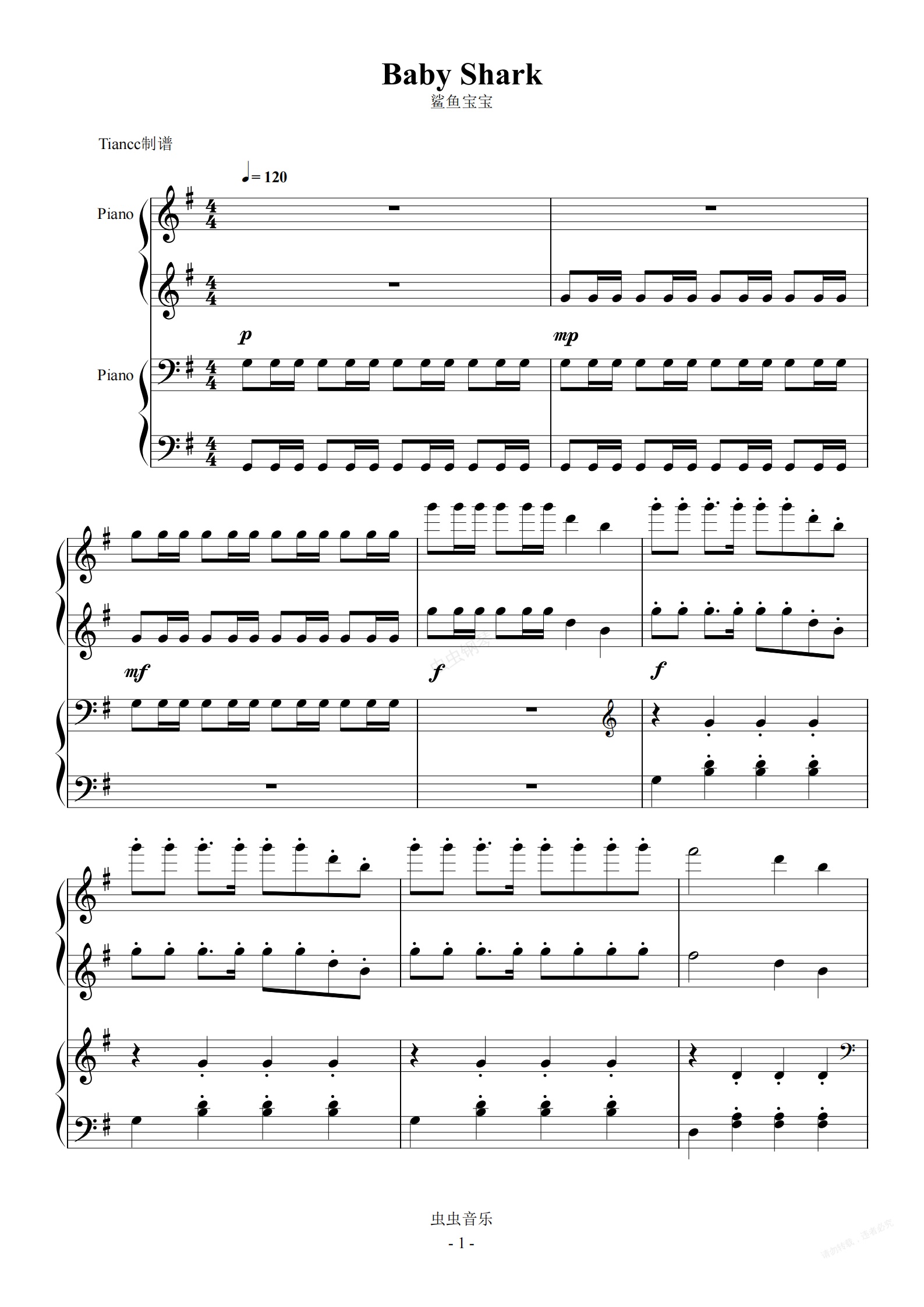 钢琴谱:《Baby Shark》鲨鱼宝宝,四手联弹谱,魔性娱乐中毒洗脑,拜厄+难度