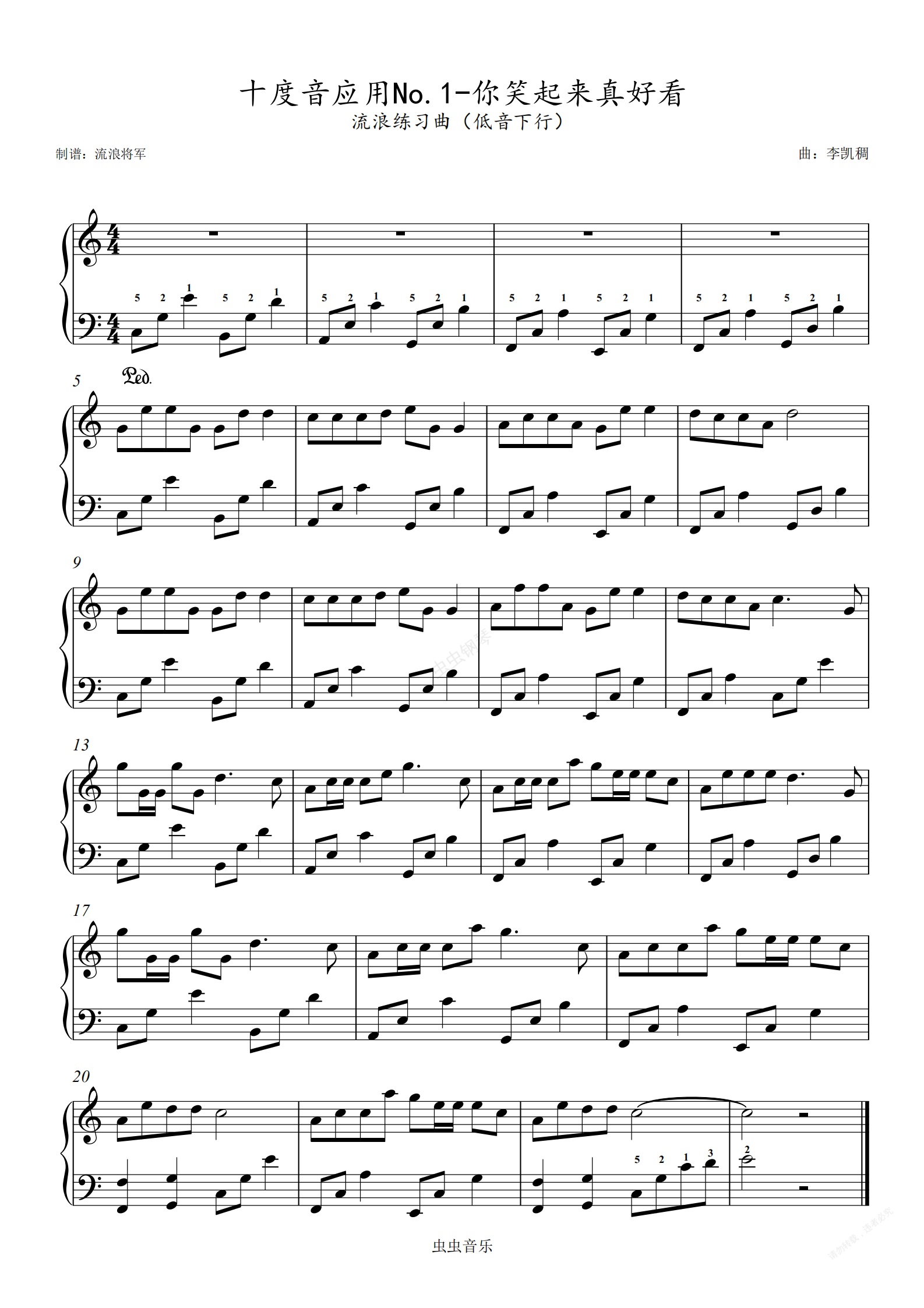 钢琴谱:快速学流行 - 十度音应用No.1(低音下行)- 你笑起来真好看