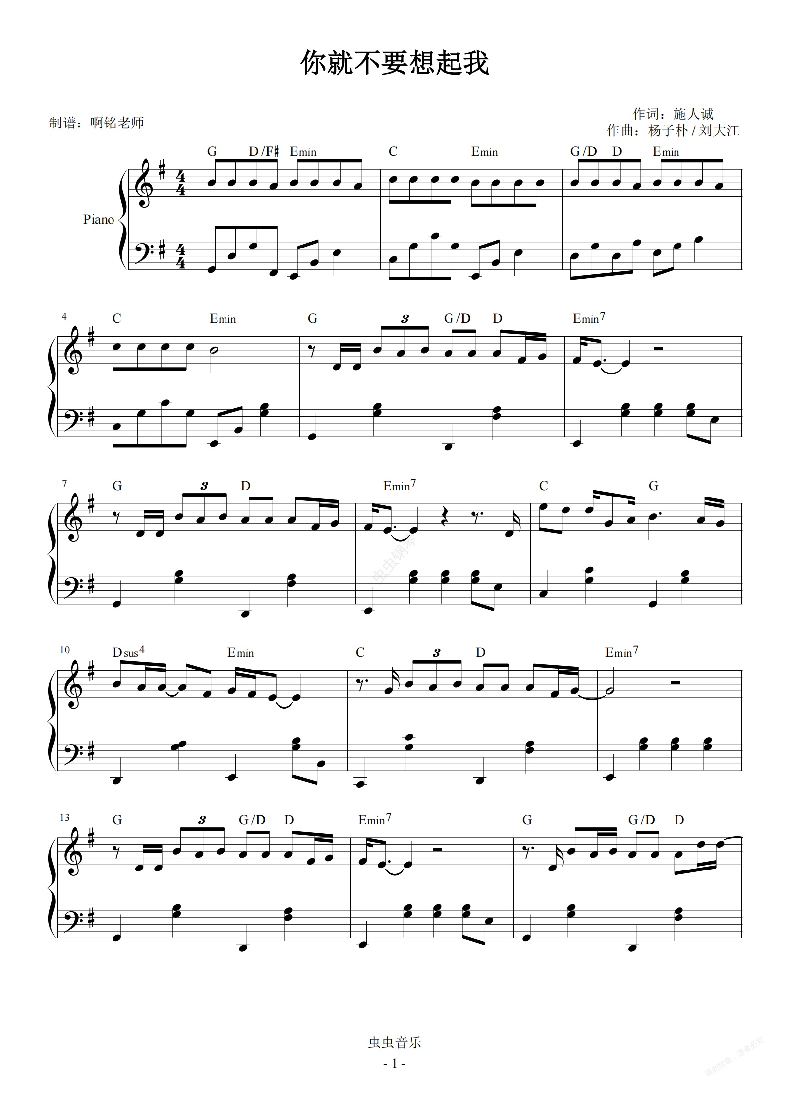 钢琴谱:你就不要想起我 G调简易