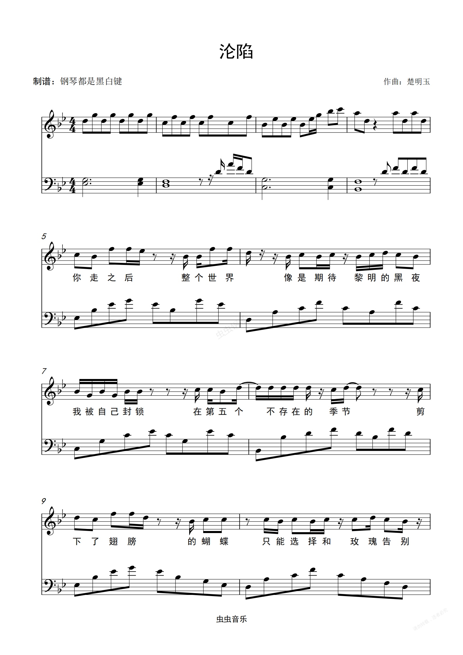 钢琴谱:沦陷 (王靖雯不胖)优美版 附歌词