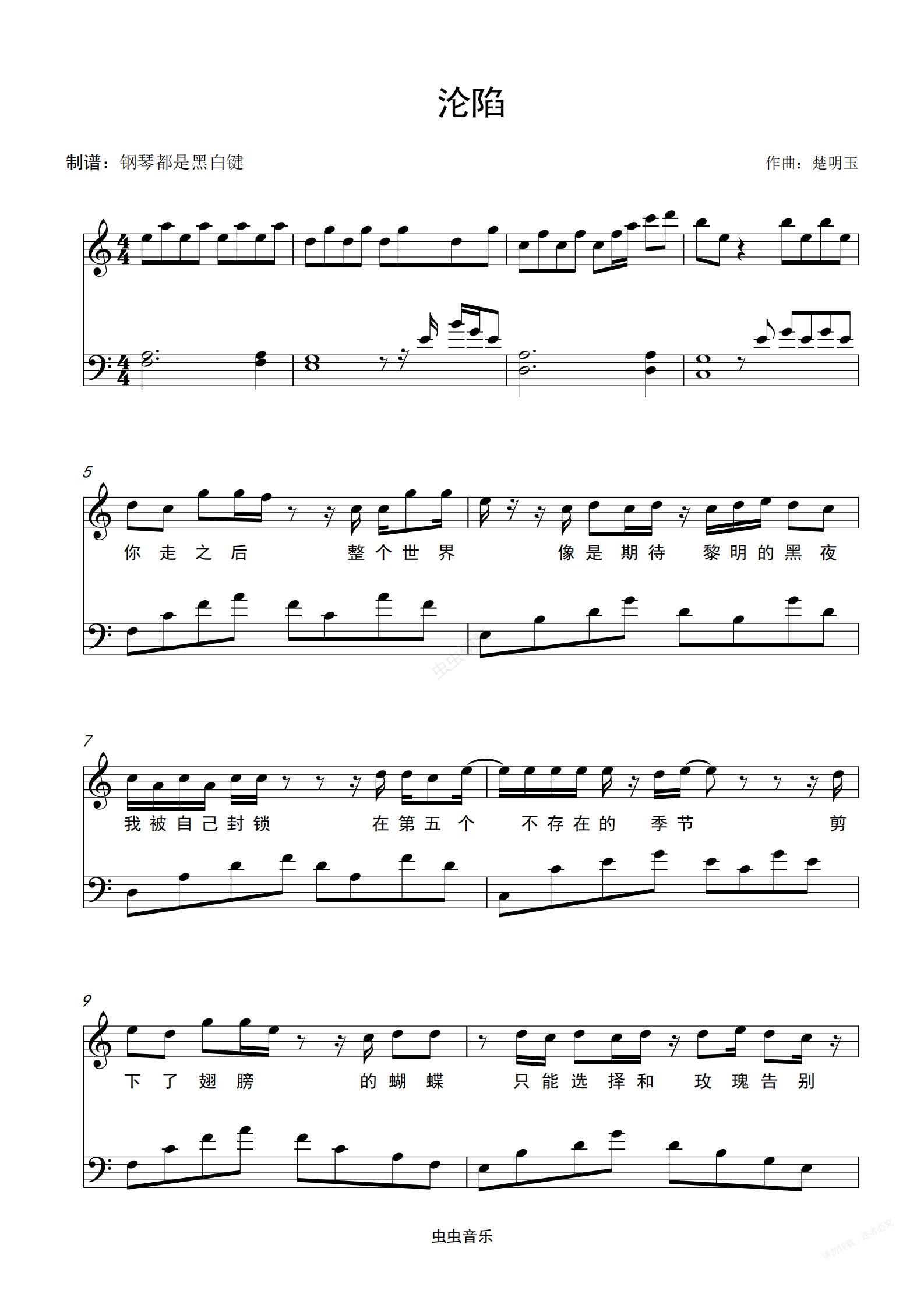 钢琴谱:沦陷 (王靖雯不胖)C大调优美版 附歌词