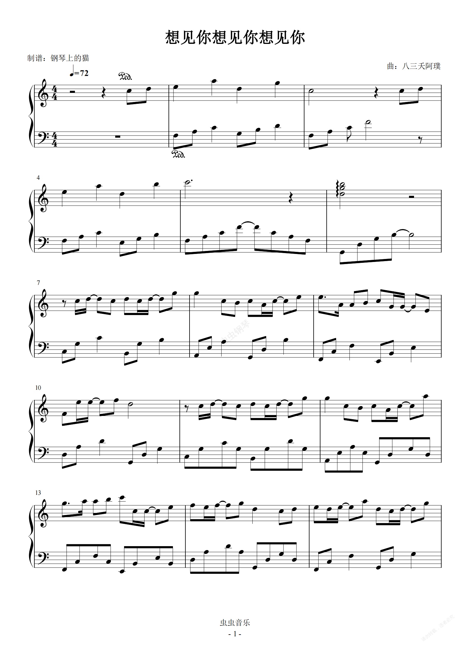 钢琴谱:想见你想见你想见你 C调简易版