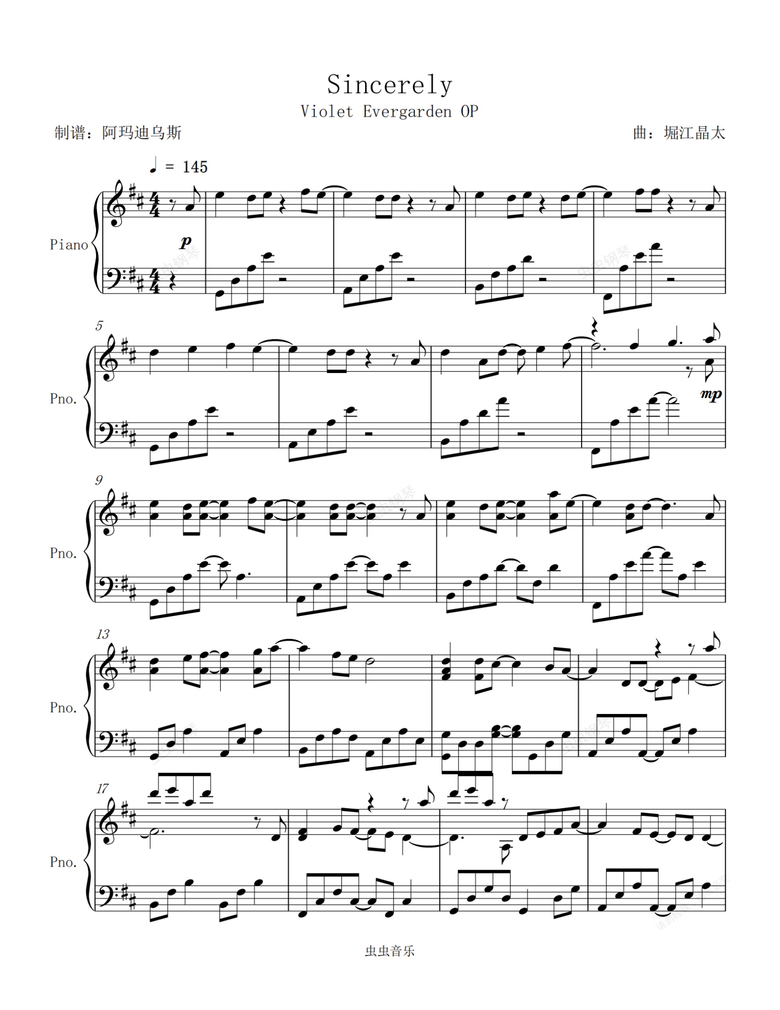 钢琴谱:紫罗兰永恒花园 OP < Sincerely > 原调高还原完整版本