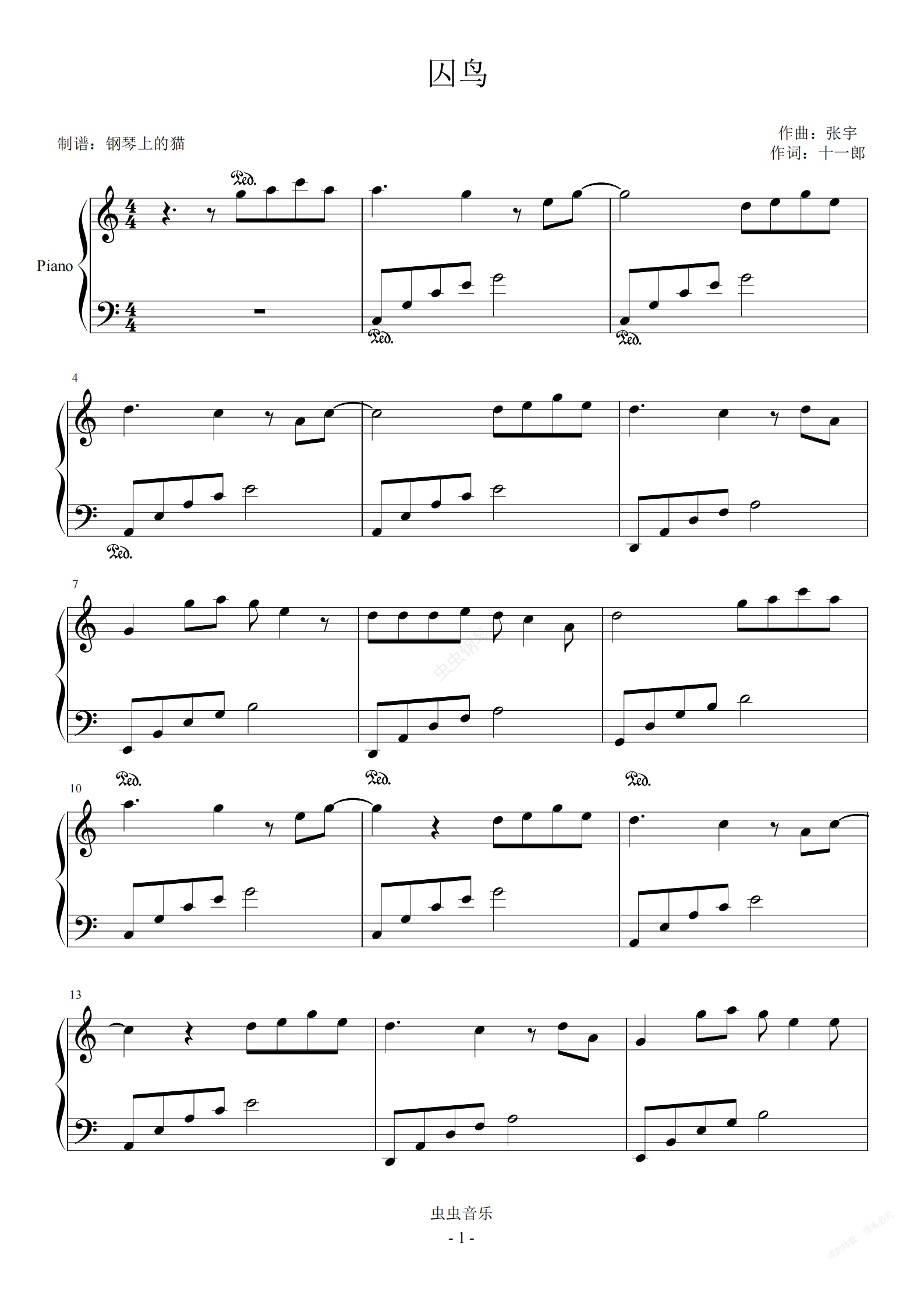 钢琴谱:囚鸟 C调简易版