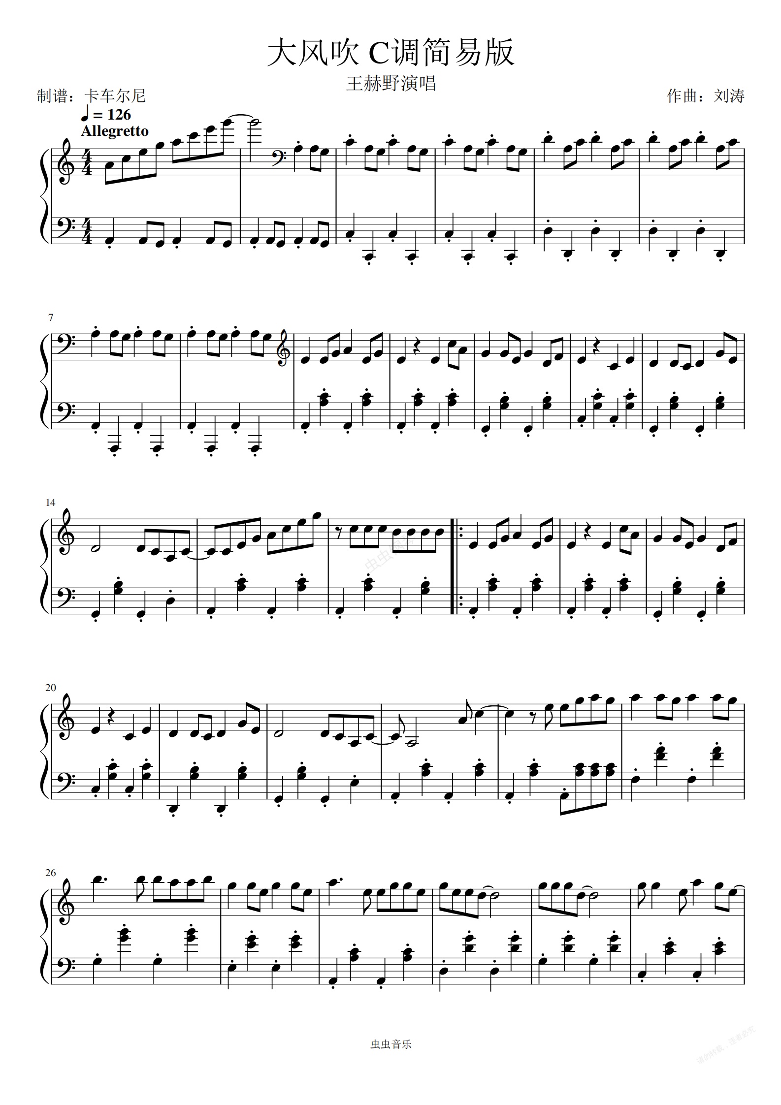 钢琴谱:抖音热曲 大风吹 C调简易版