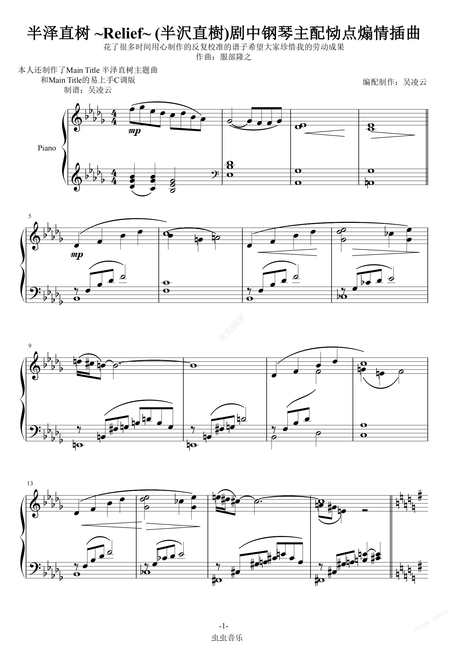 钢琴谱:半泽直树 ~Relief~ (半沢直樹)剧中 钢琴主配恸点煽情插曲 吴凌云钢琴演奏版