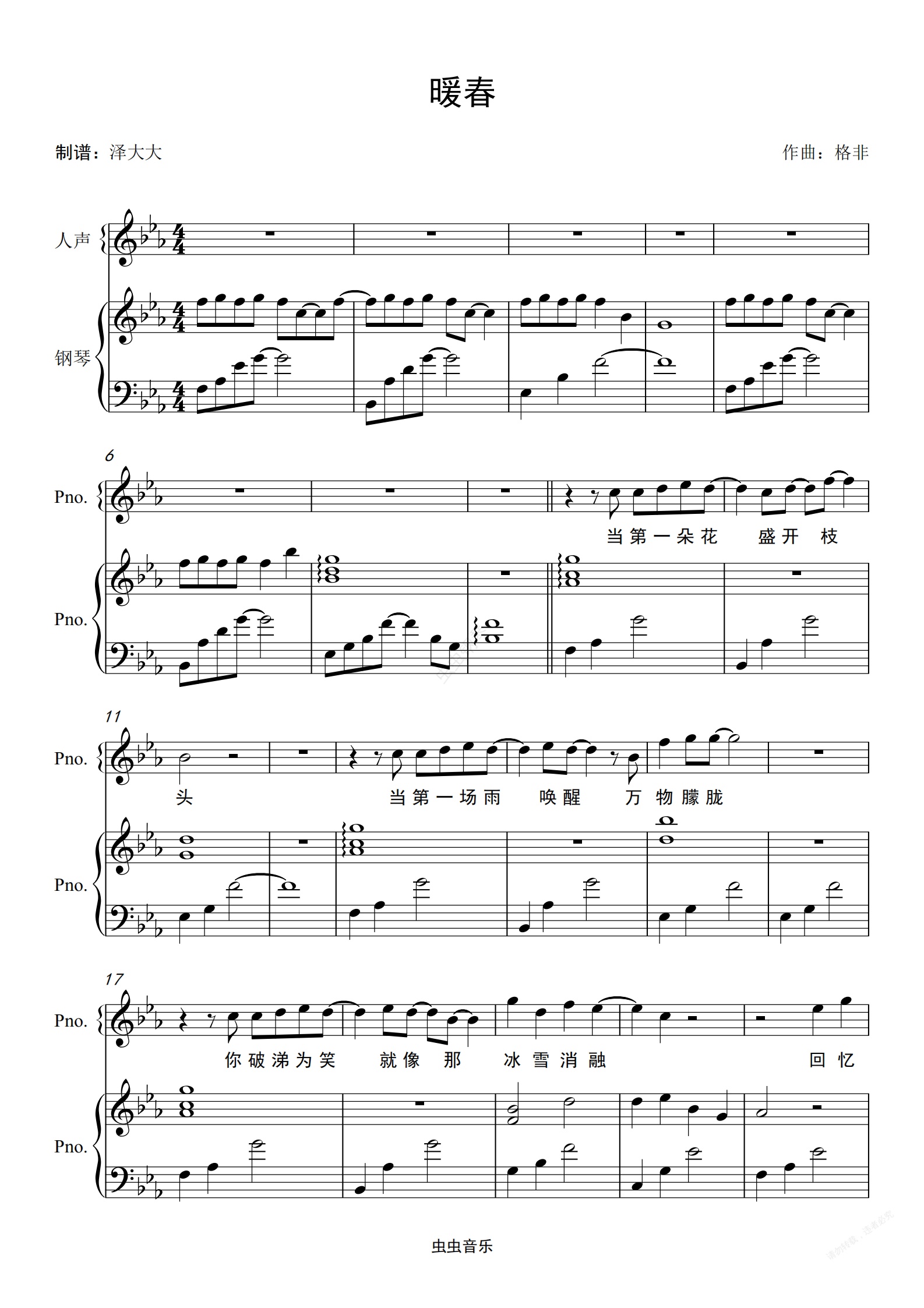 钢琴谱:暖春【完美伴奏附词】泽大大 牛奶咖啡