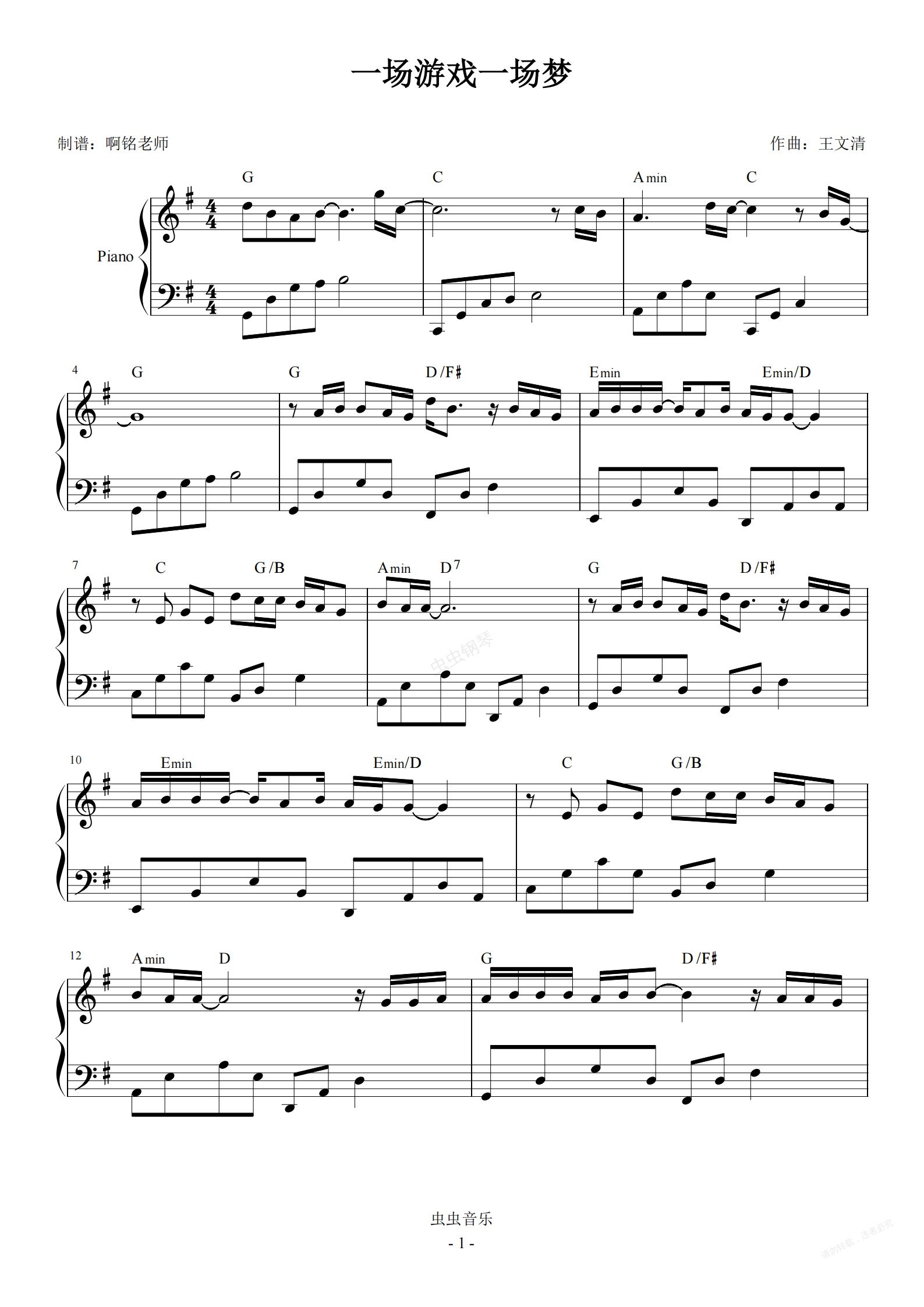 钢琴谱:一场游戏一场梦 怀旧 简易