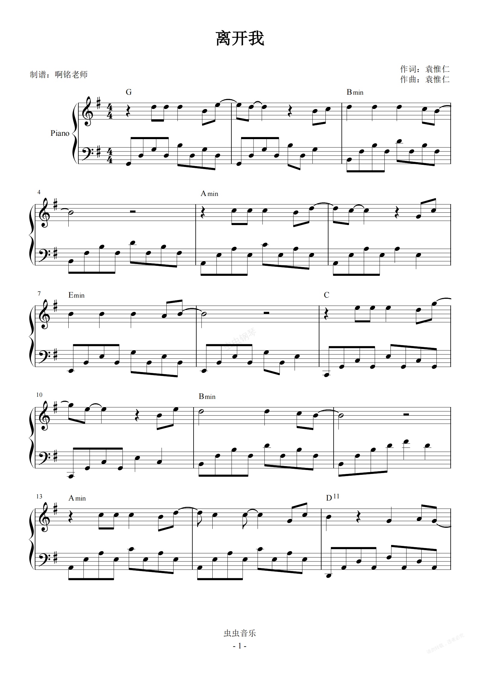 钢琴谱:离开我 G调简易