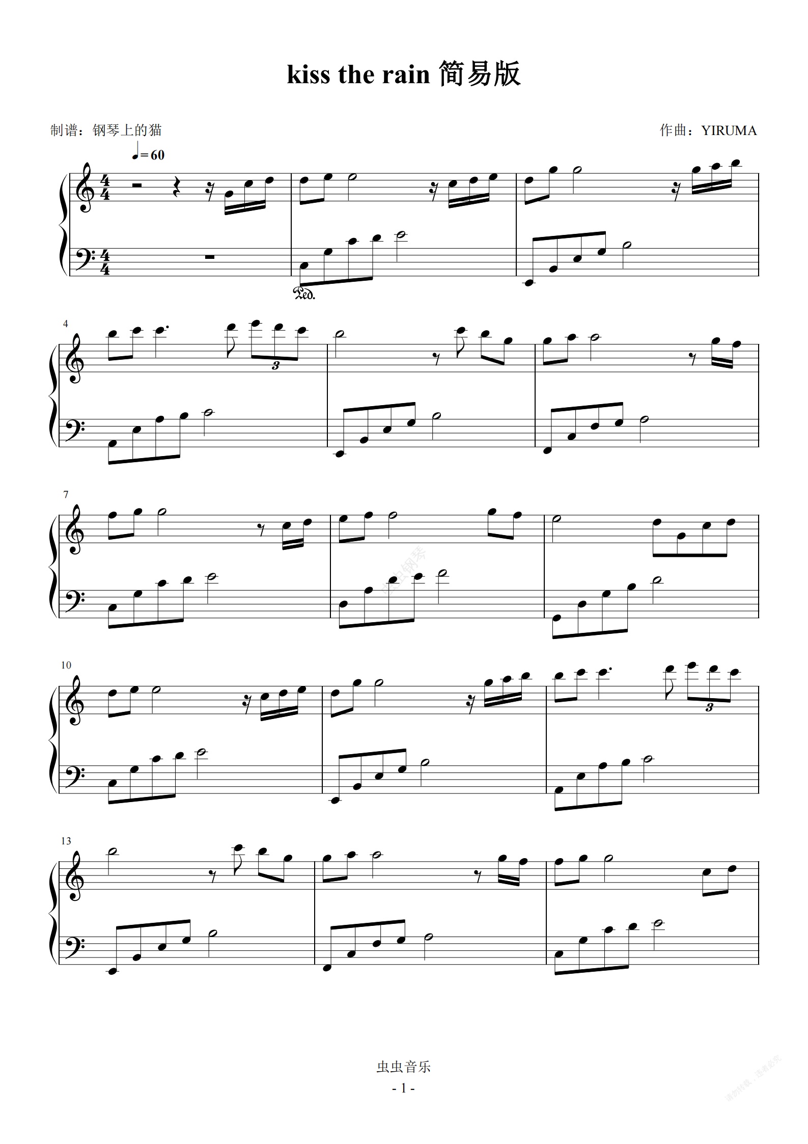 钢琴谱:kiss the rain 雨的印记 C调简易版