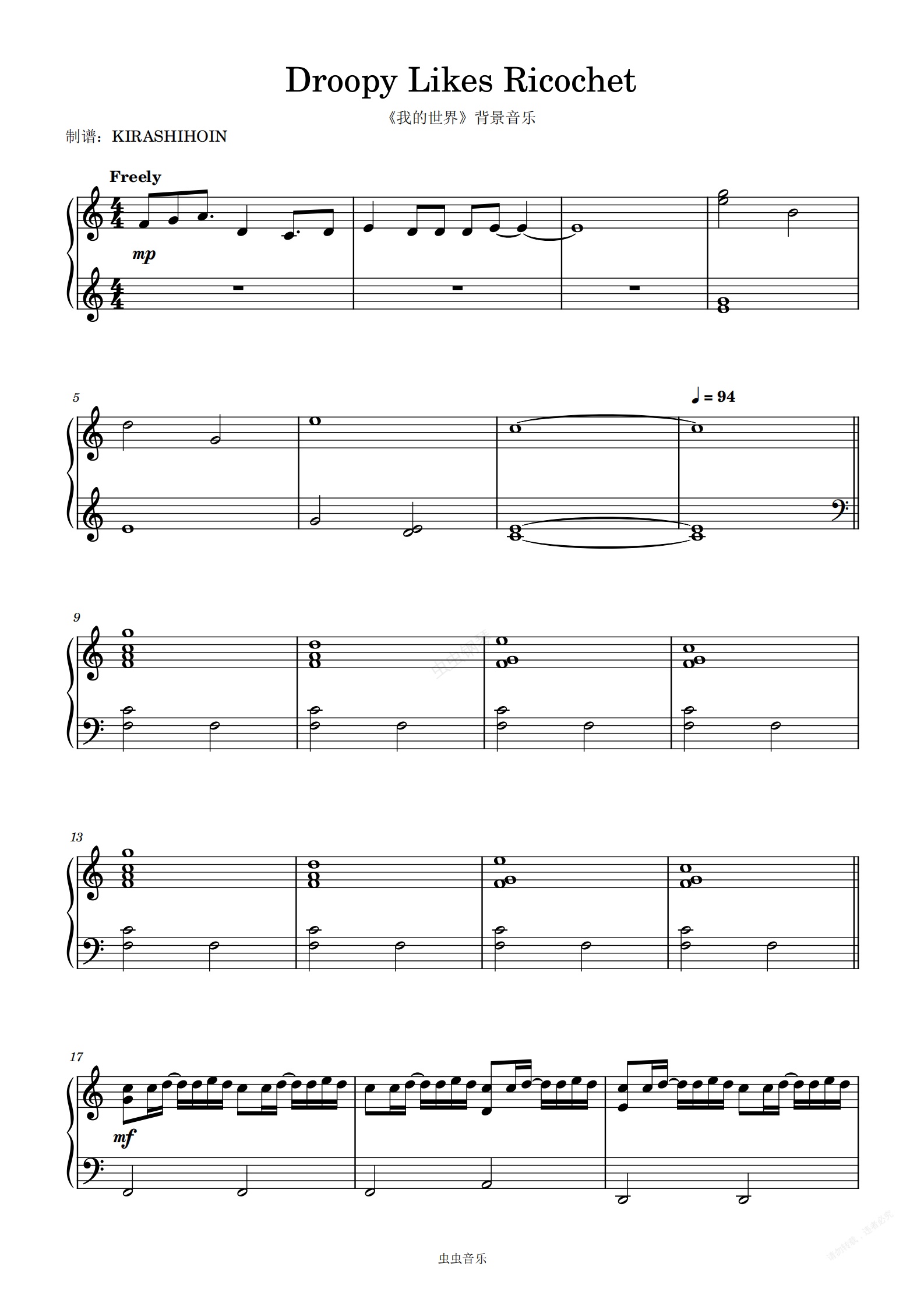 钢琴谱:Droopy Likes Ricochet(《我的世界》背景音乐)