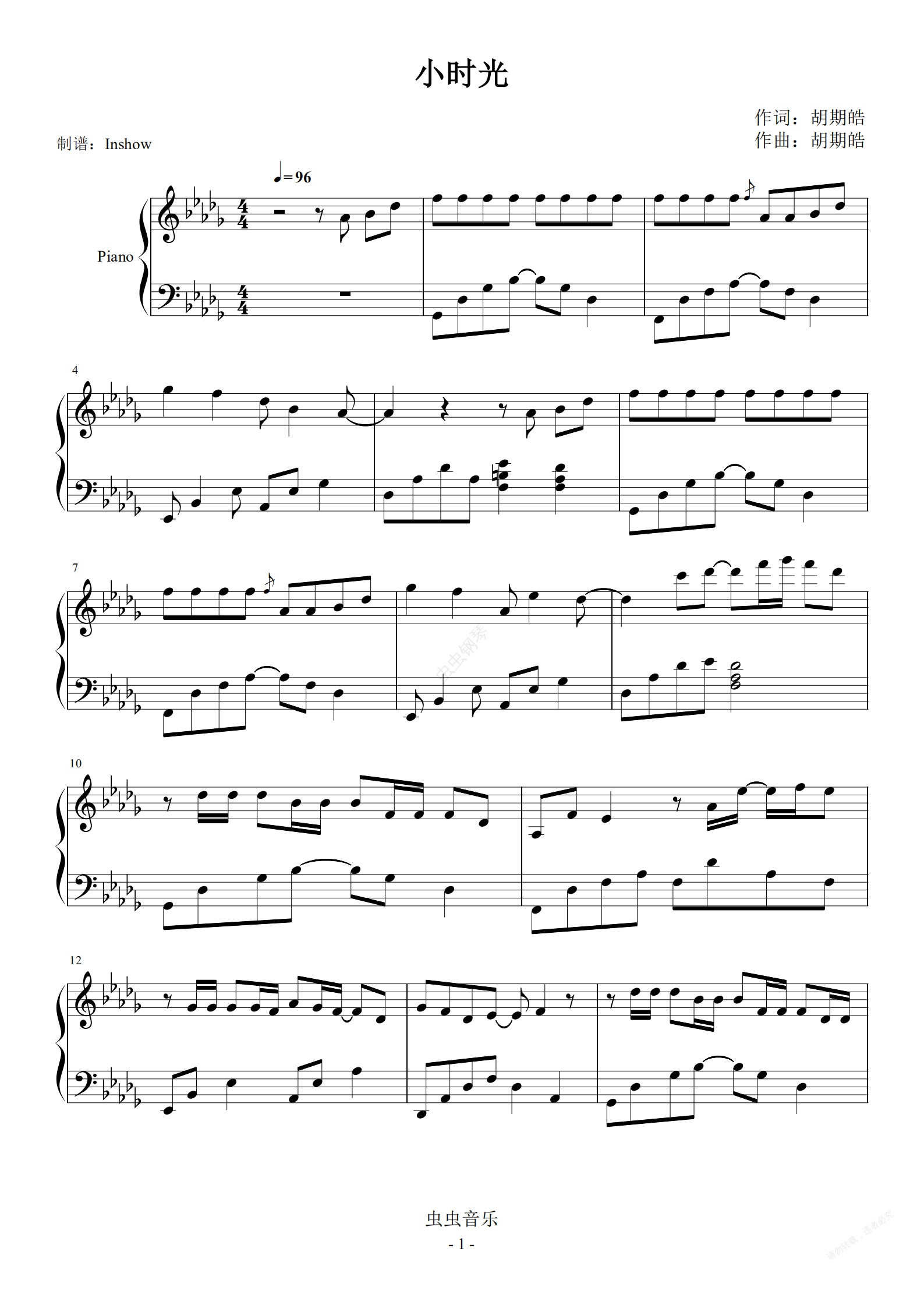 钢琴谱:小时光【独奏】- 胡期皓 -