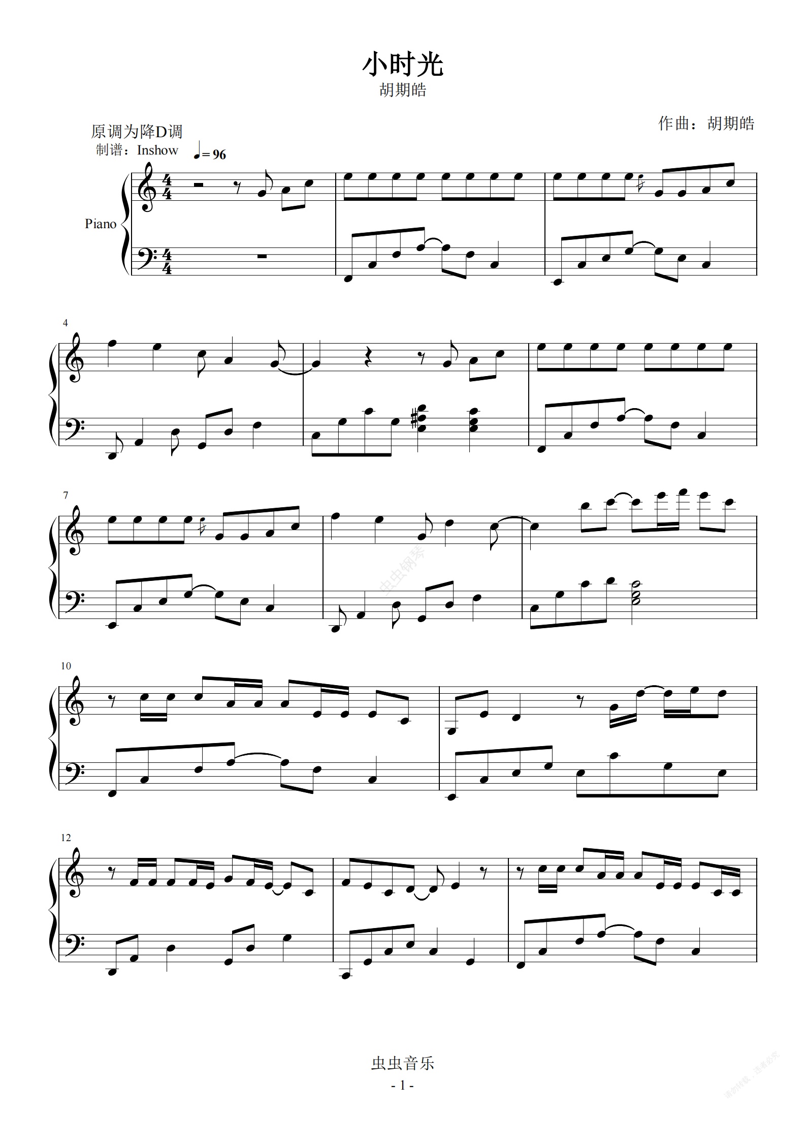 钢琴谱:小时光【C调独奏】- 胡期皓 -