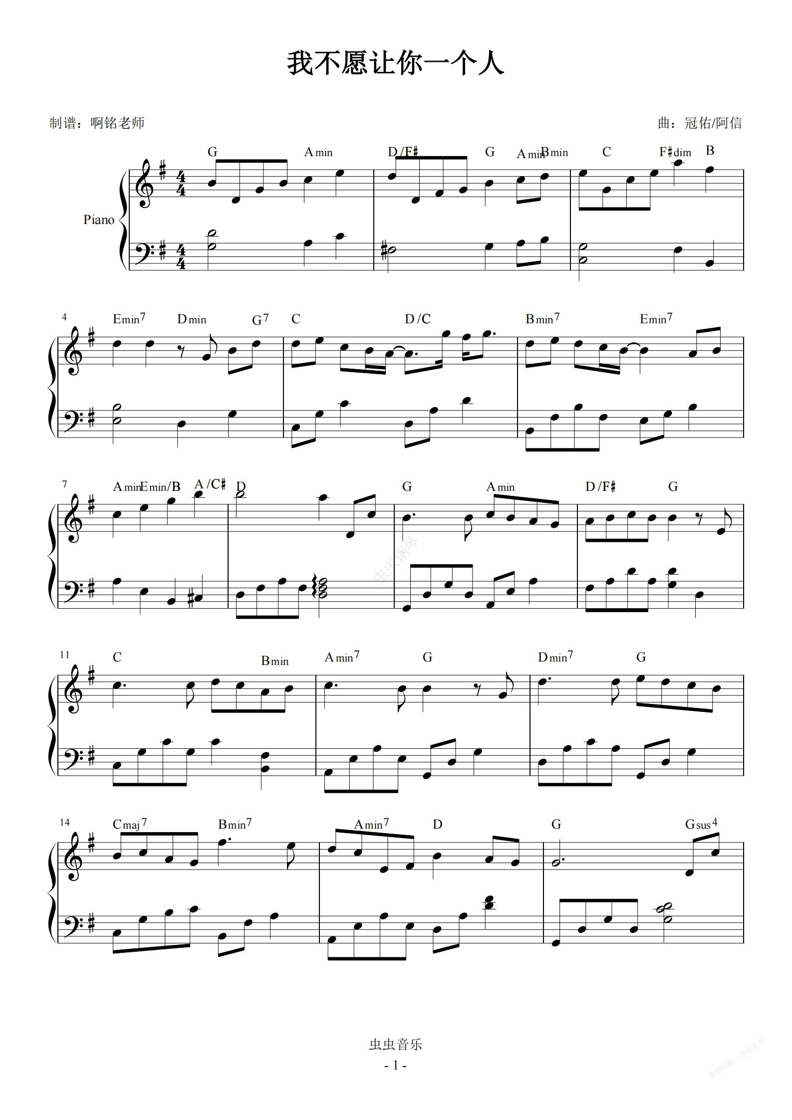 钢琴谱:我不愿让你一个人 G调简易版
