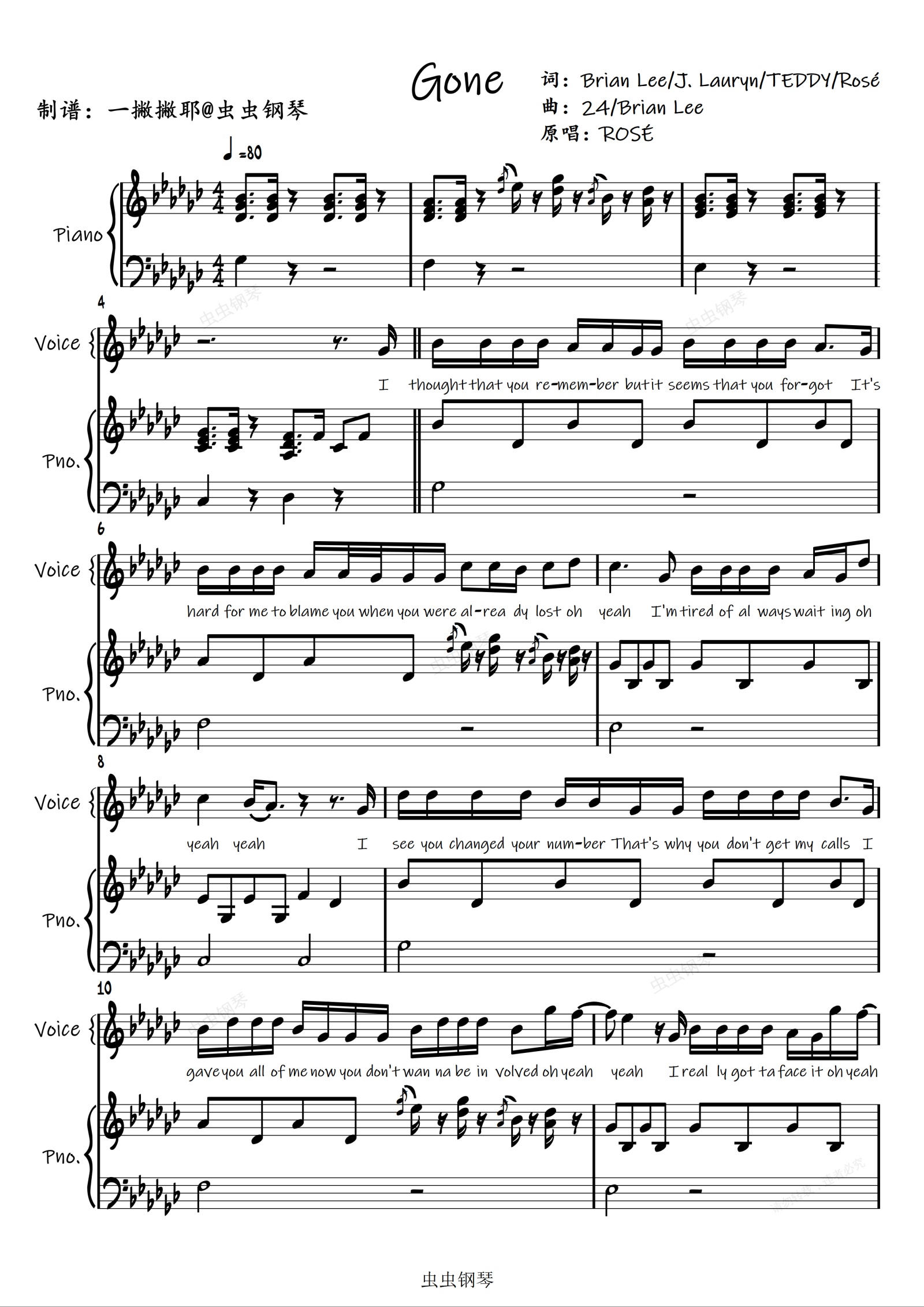 钢琴谱:Gone【弹唱谱】ROSÉ朴彩英「一撇撇耶」