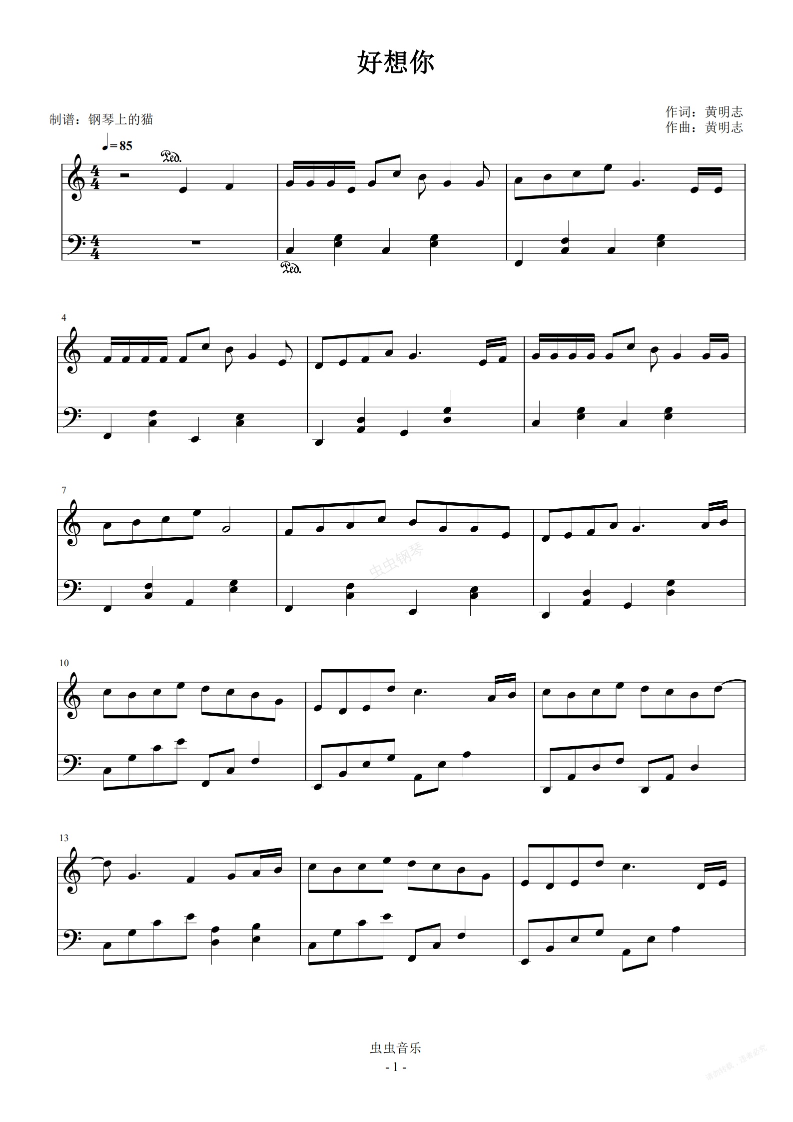 钢琴谱:好想你 C调简易版