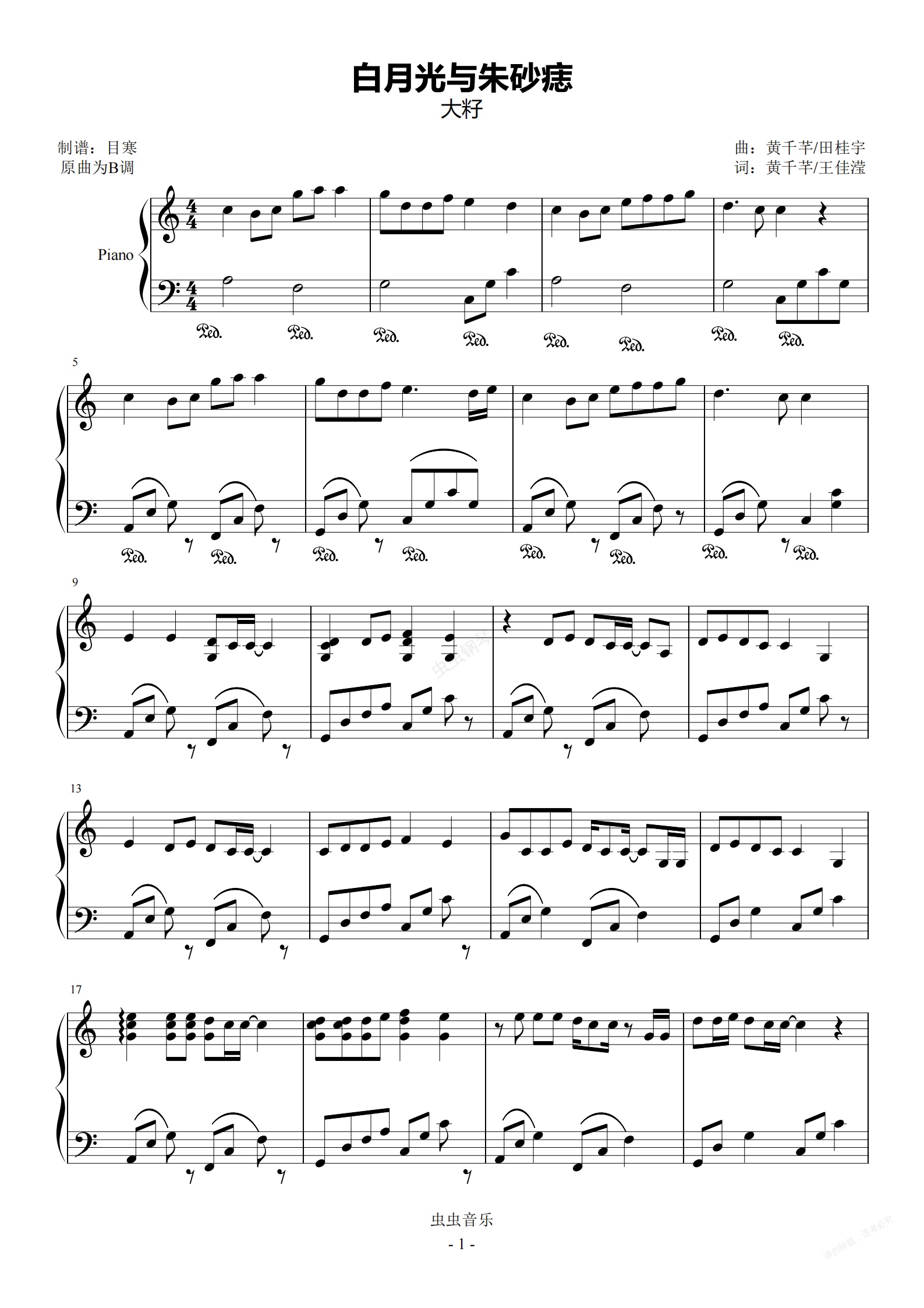 钢琴谱:白月光与朱砂痣(C调简易演奏版)