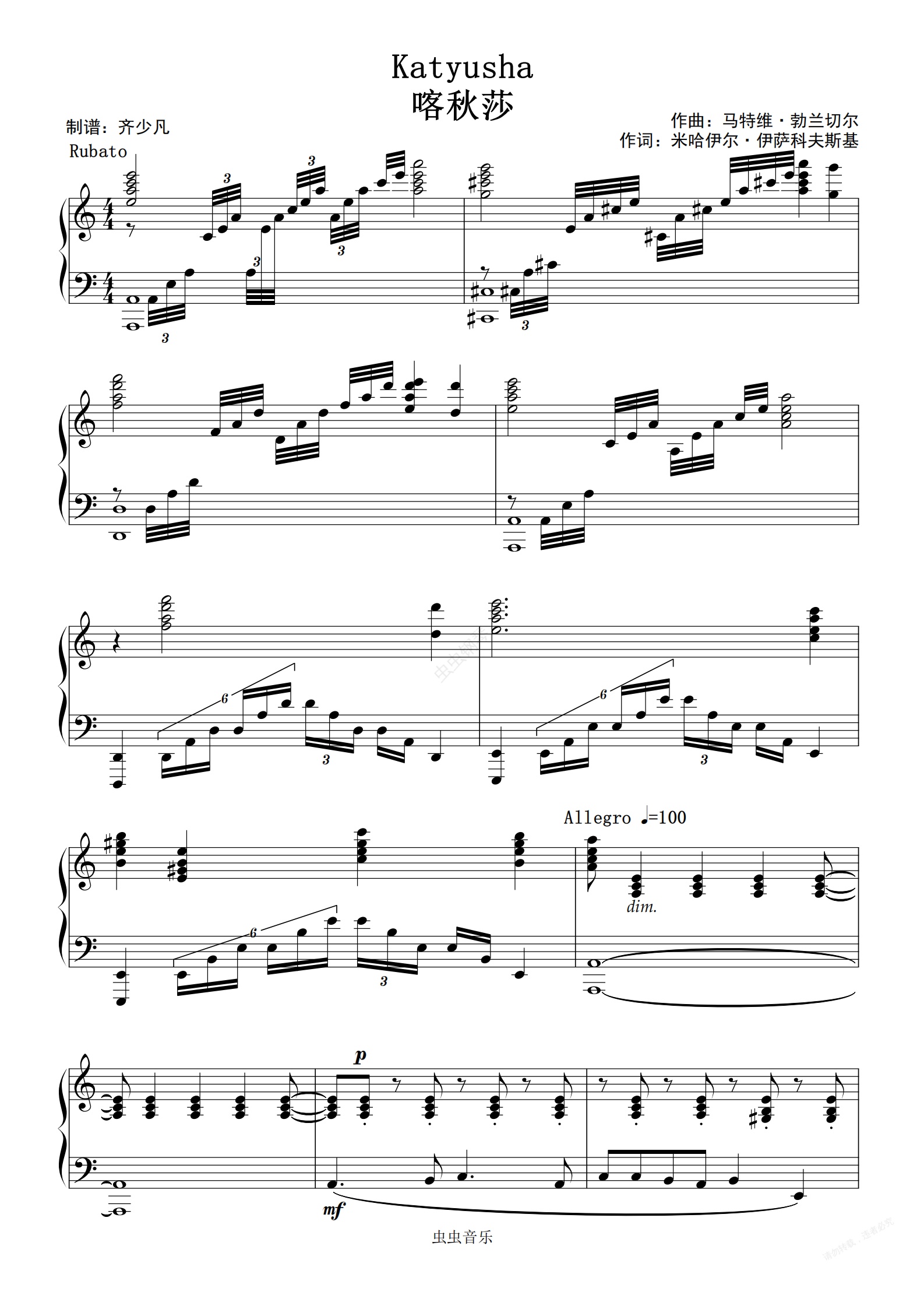 钢琴谱:【精制】喀秋莎-钢琴独奏