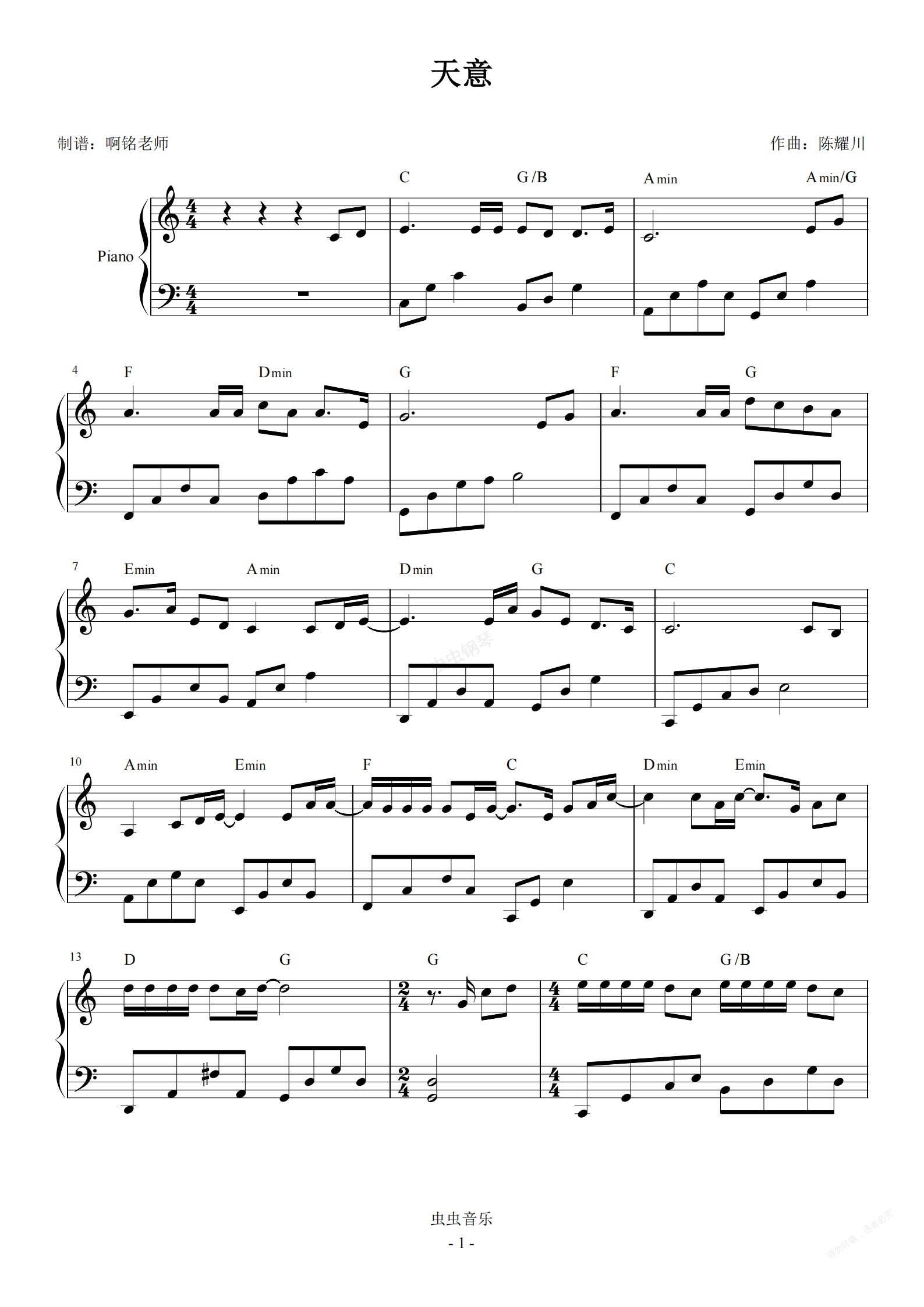 钢琴谱:天意 C调简易 怀旧经典
