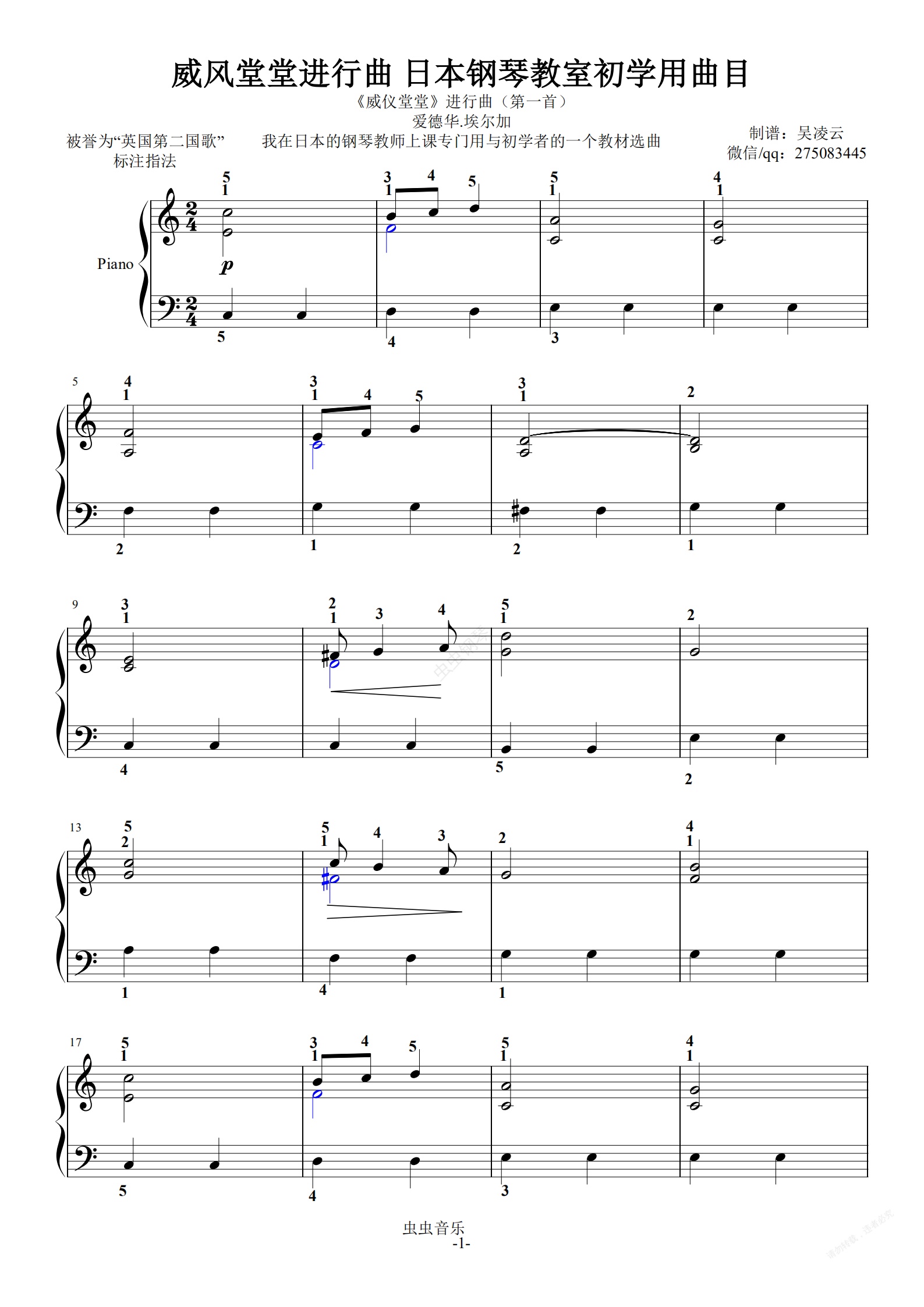钢琴谱:威风堂堂进行曲 日本钢琴教室初学用曲目 吴凌云制