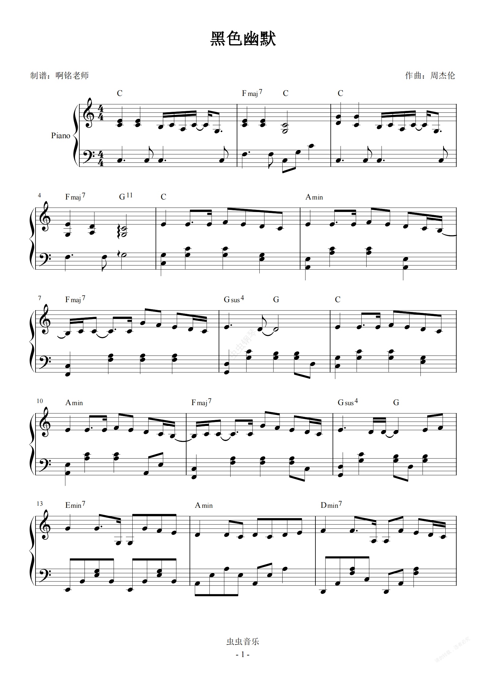 钢琴谱:黑色幽默 C调简易 原版和弦