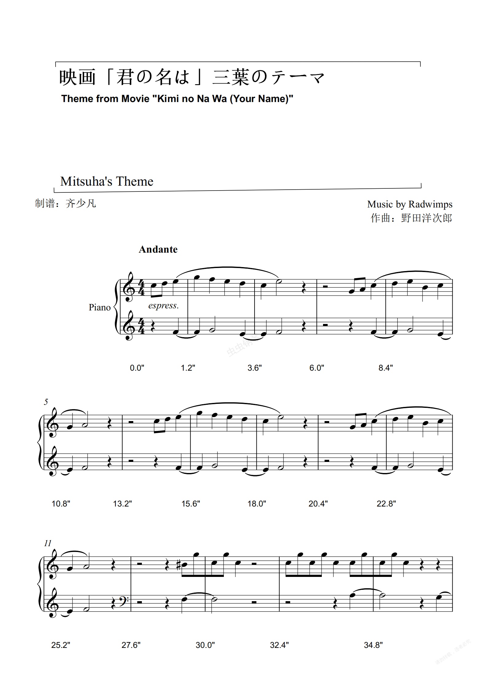 钢琴谱:三葉のテーマ-你的名字