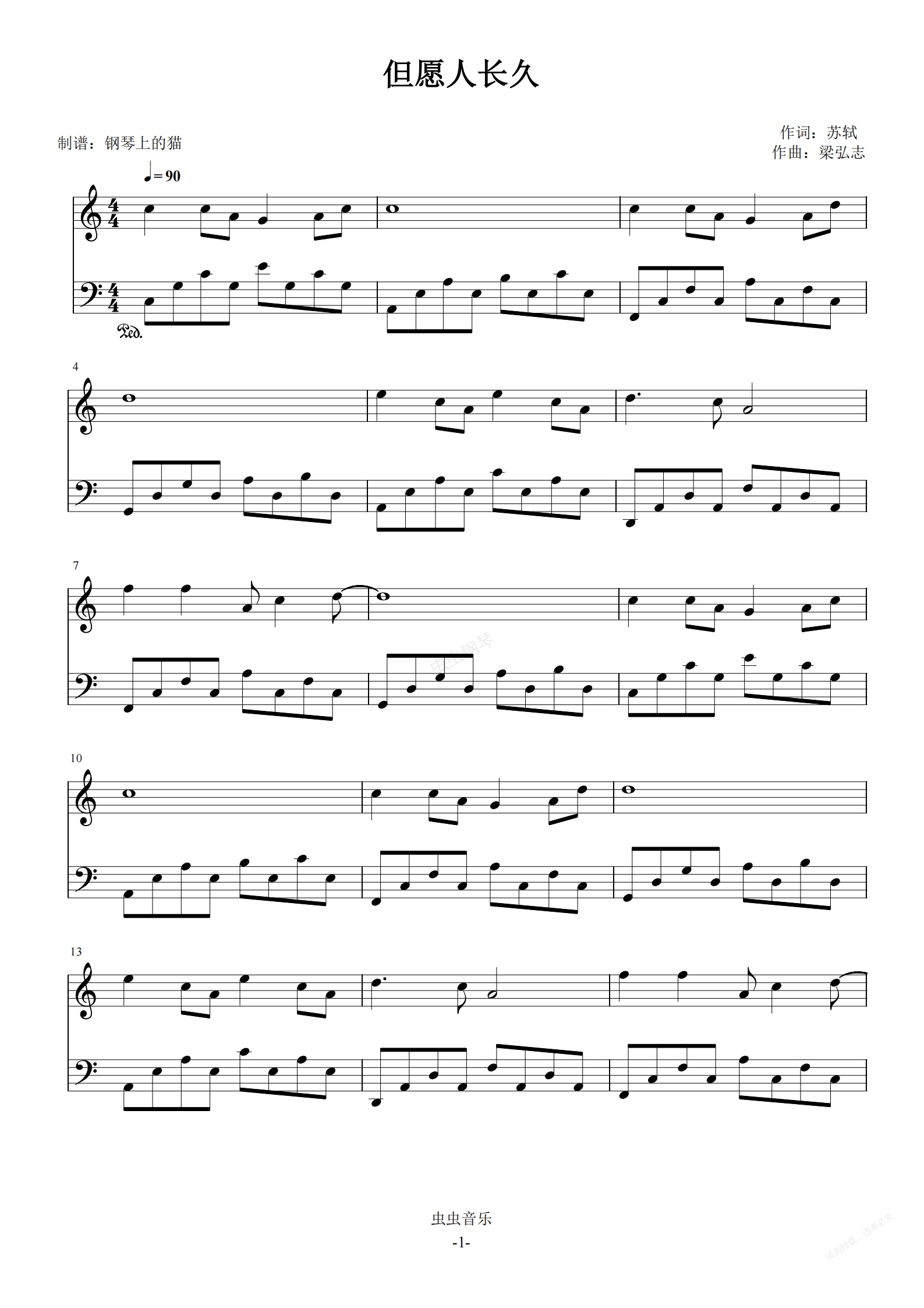 钢琴谱:但愿人长久 C调简易