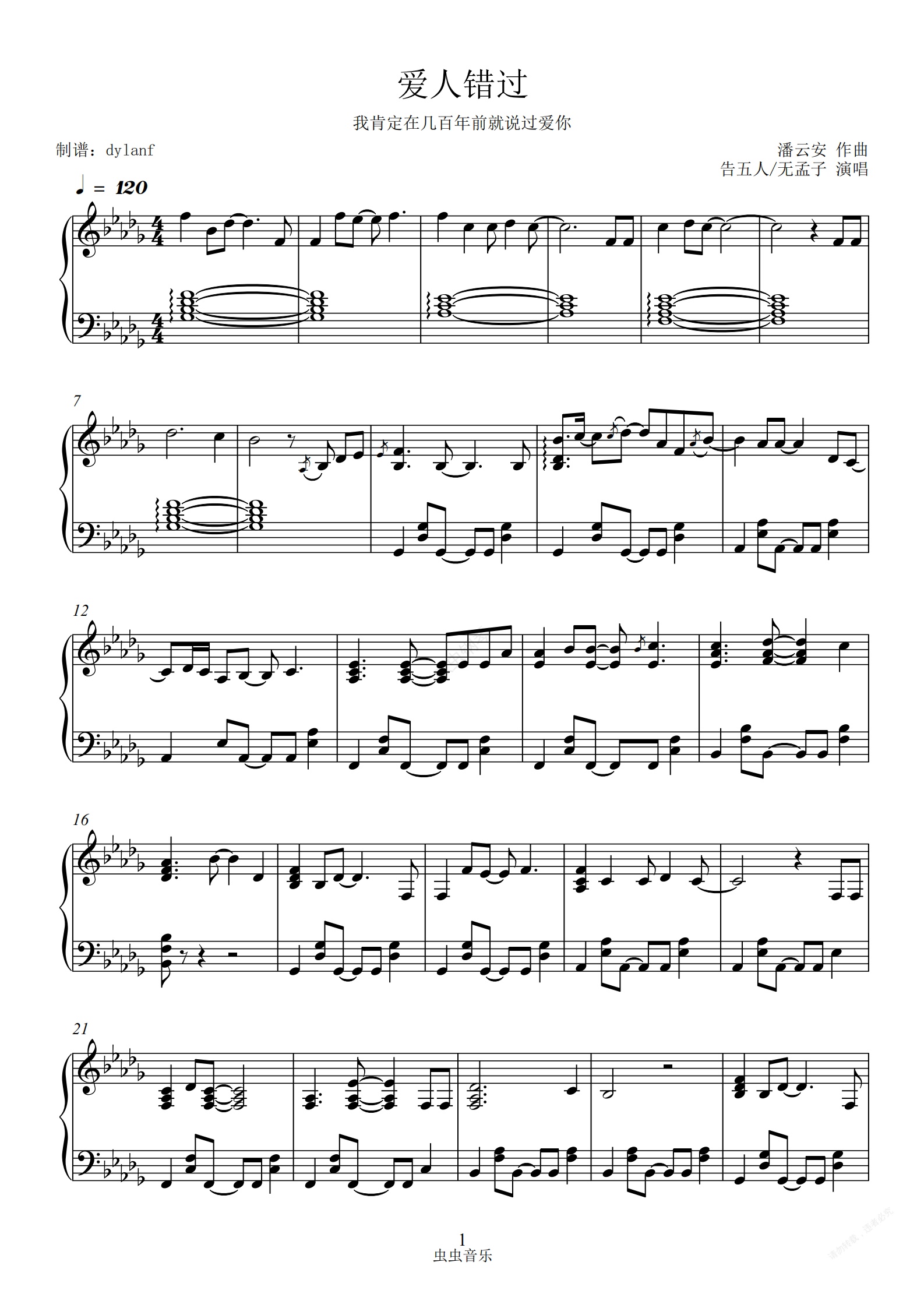 钢琴谱:爱人错过(唯美版) 高度还原 无孟子 告五人
