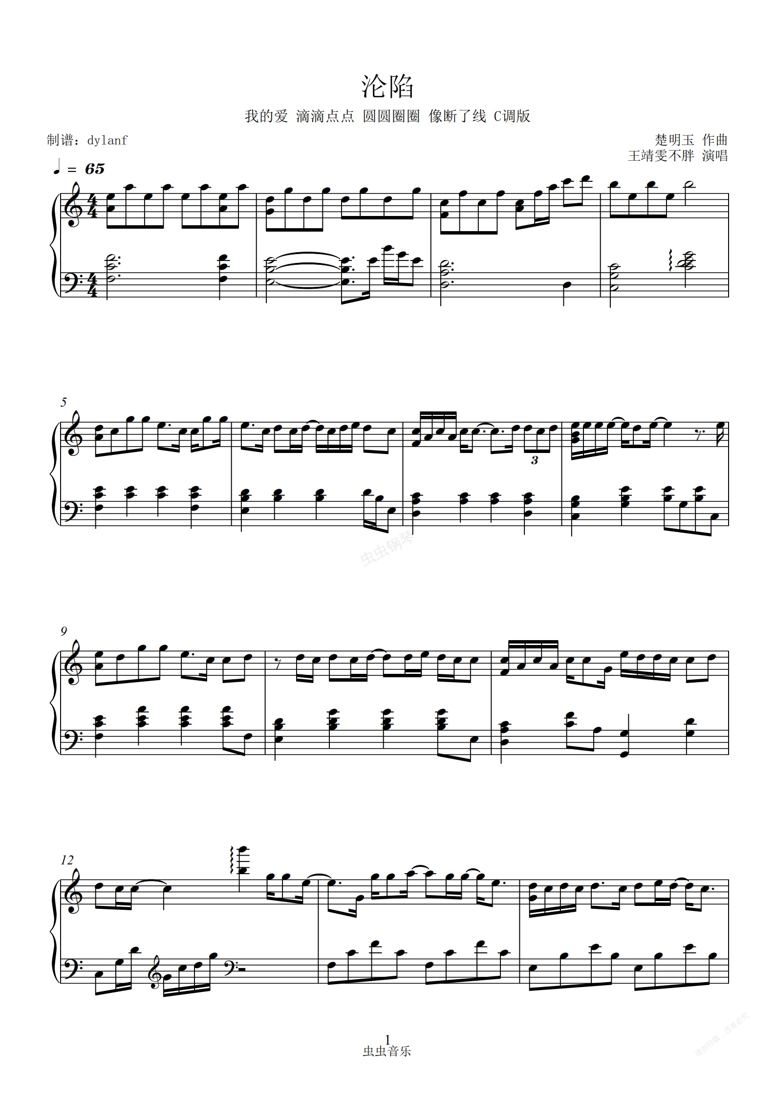 钢琴谱:C调易弹 沦陷 高度还原 王靖雯不胖