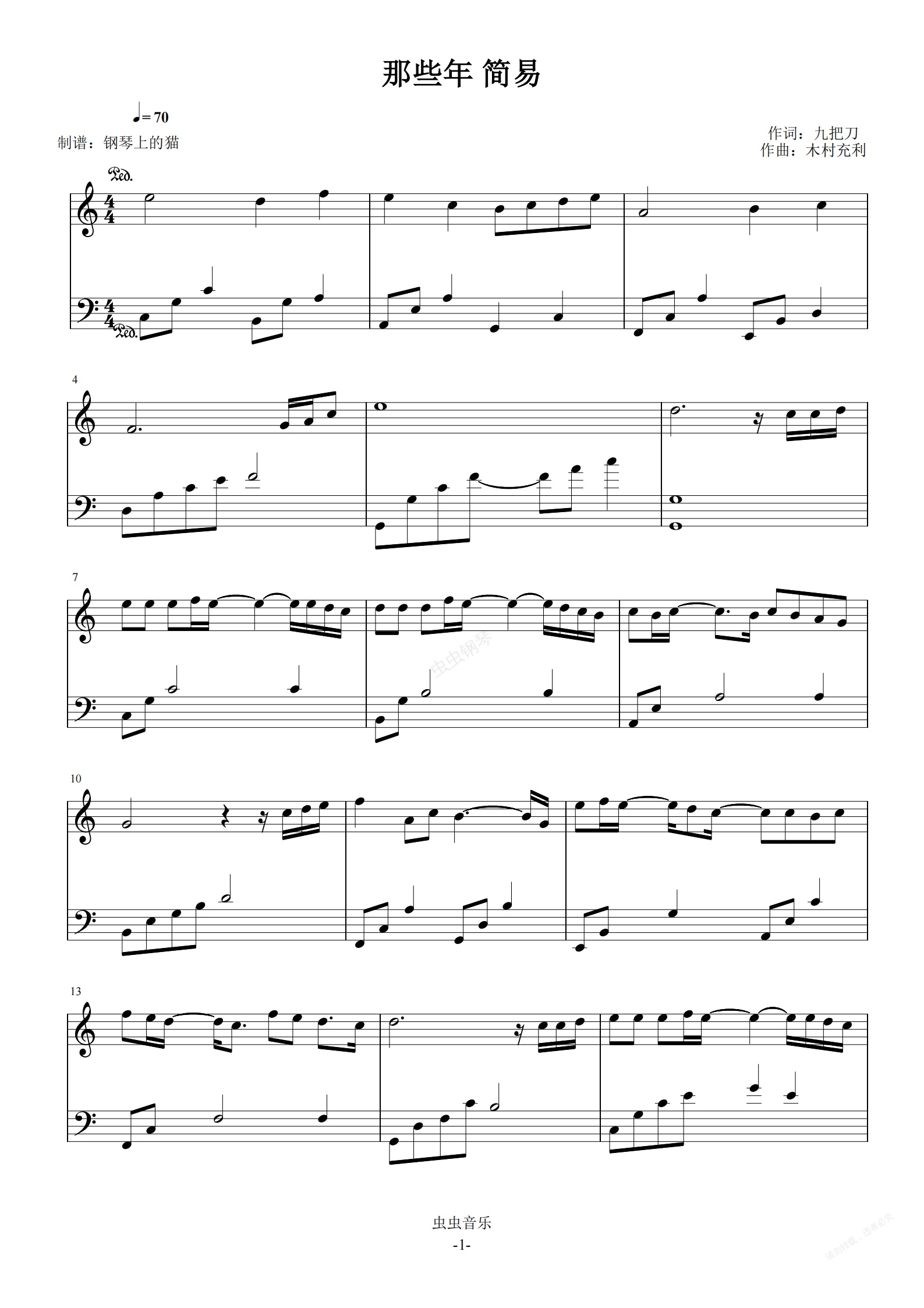 钢琴谱:那些年 C调简易版