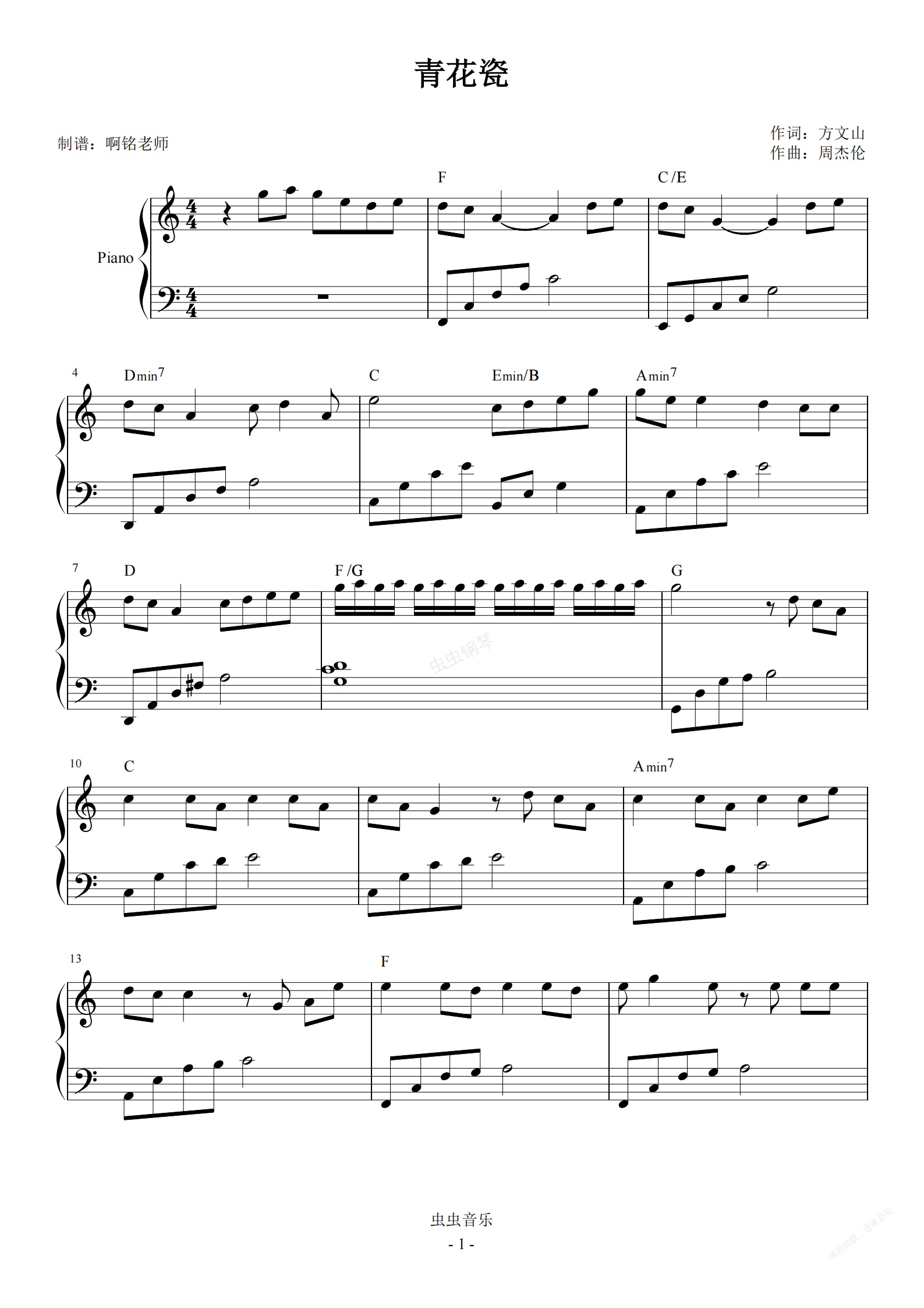 钢琴谱:青花瓷 C调简易版 原曲和弦