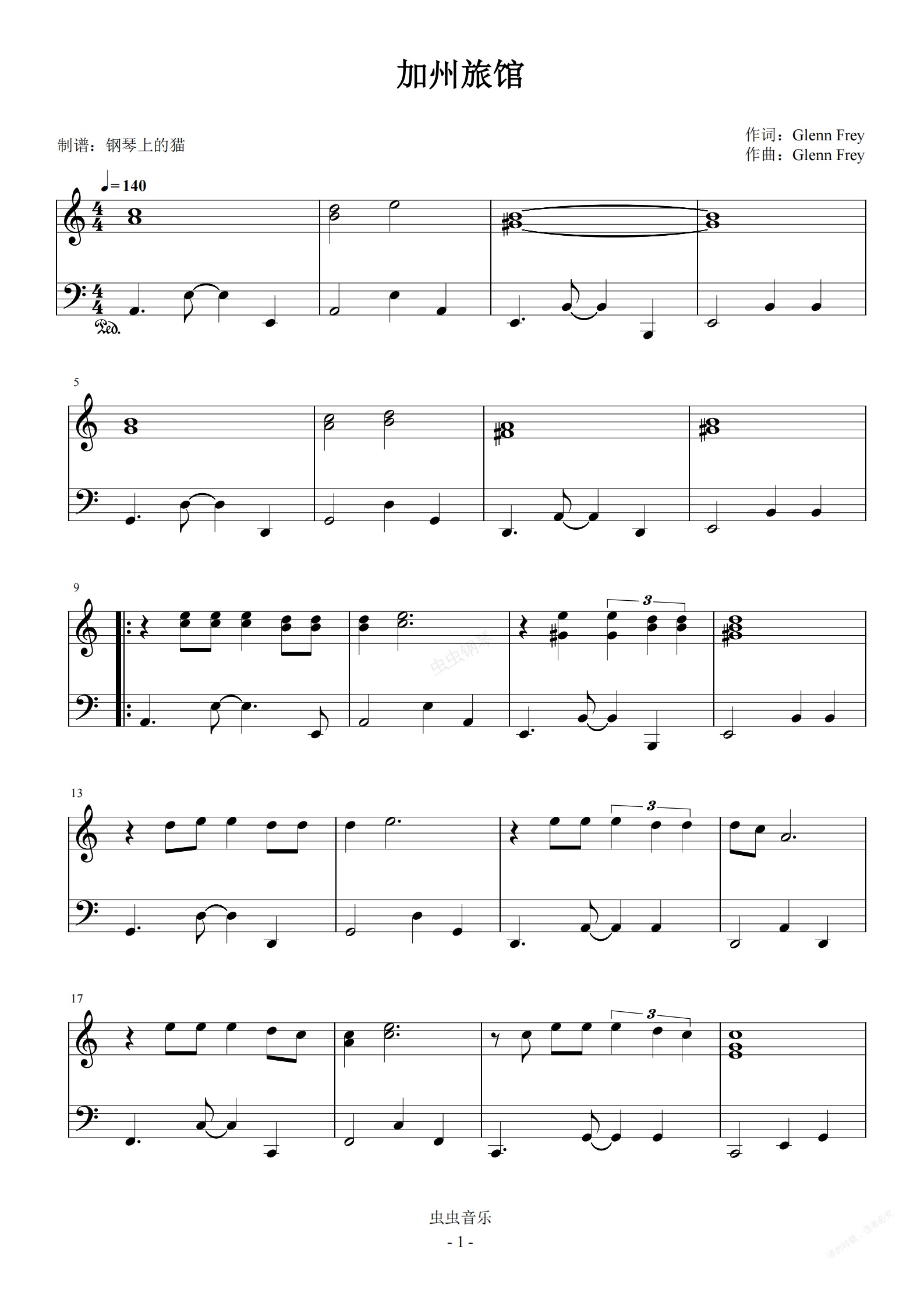 钢琴谱:加州旅馆 C调经典