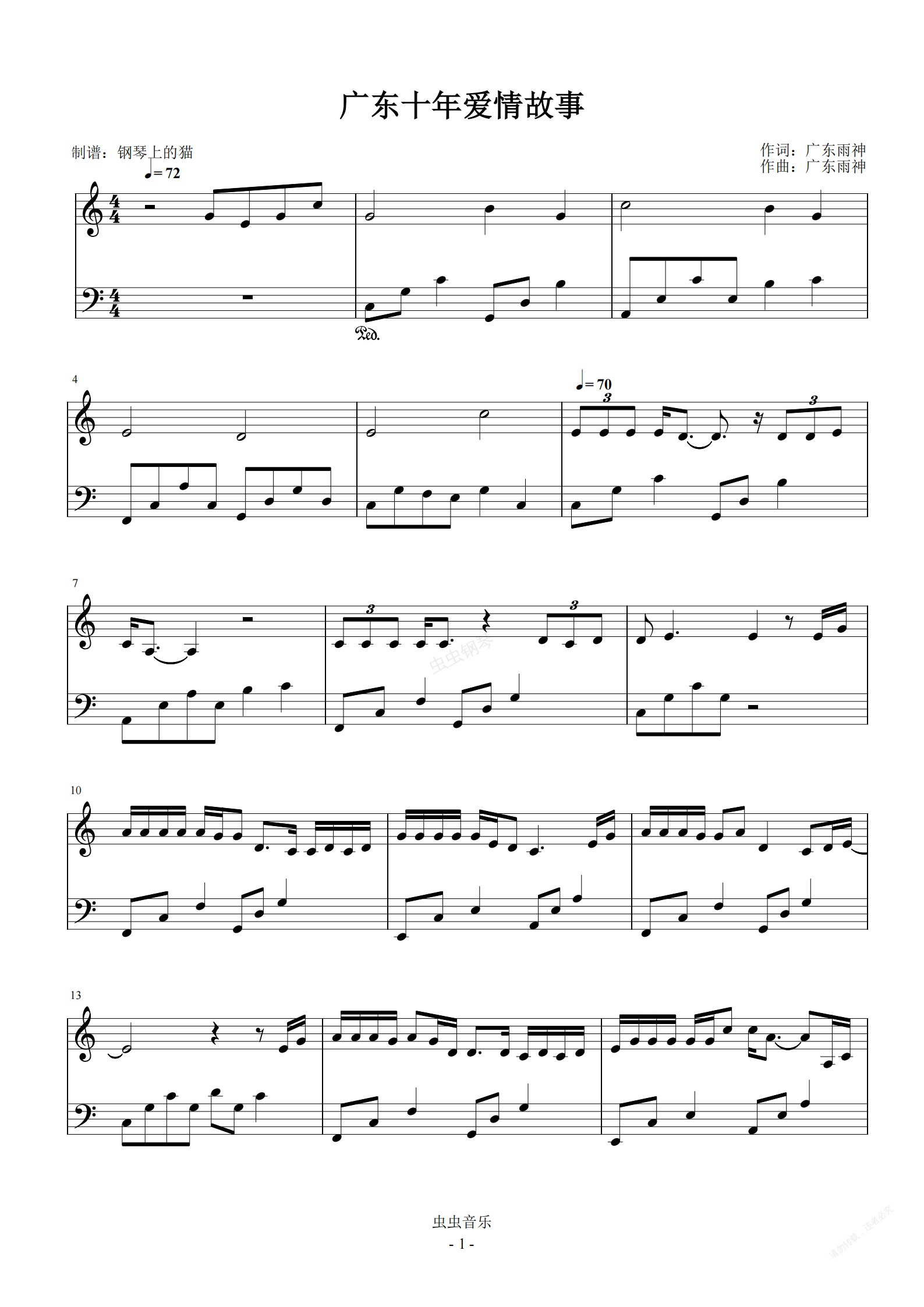钢琴谱:广东十年爱情故事 C调简易版