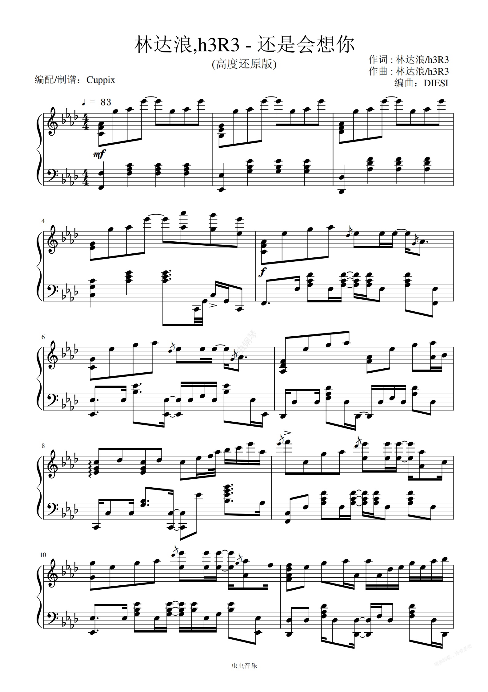钢琴谱:《还是会想你》Cuppix改编-高度还原(林达浪,h3R3)