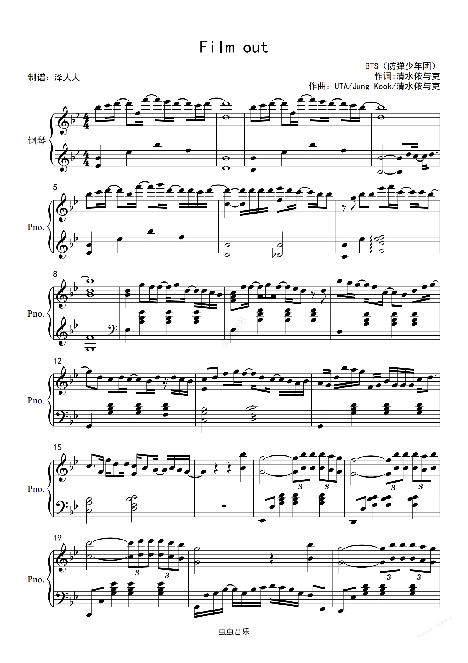 钢琴谱:Film out【完美独奏版】BTS(防弹少年团)泽大大