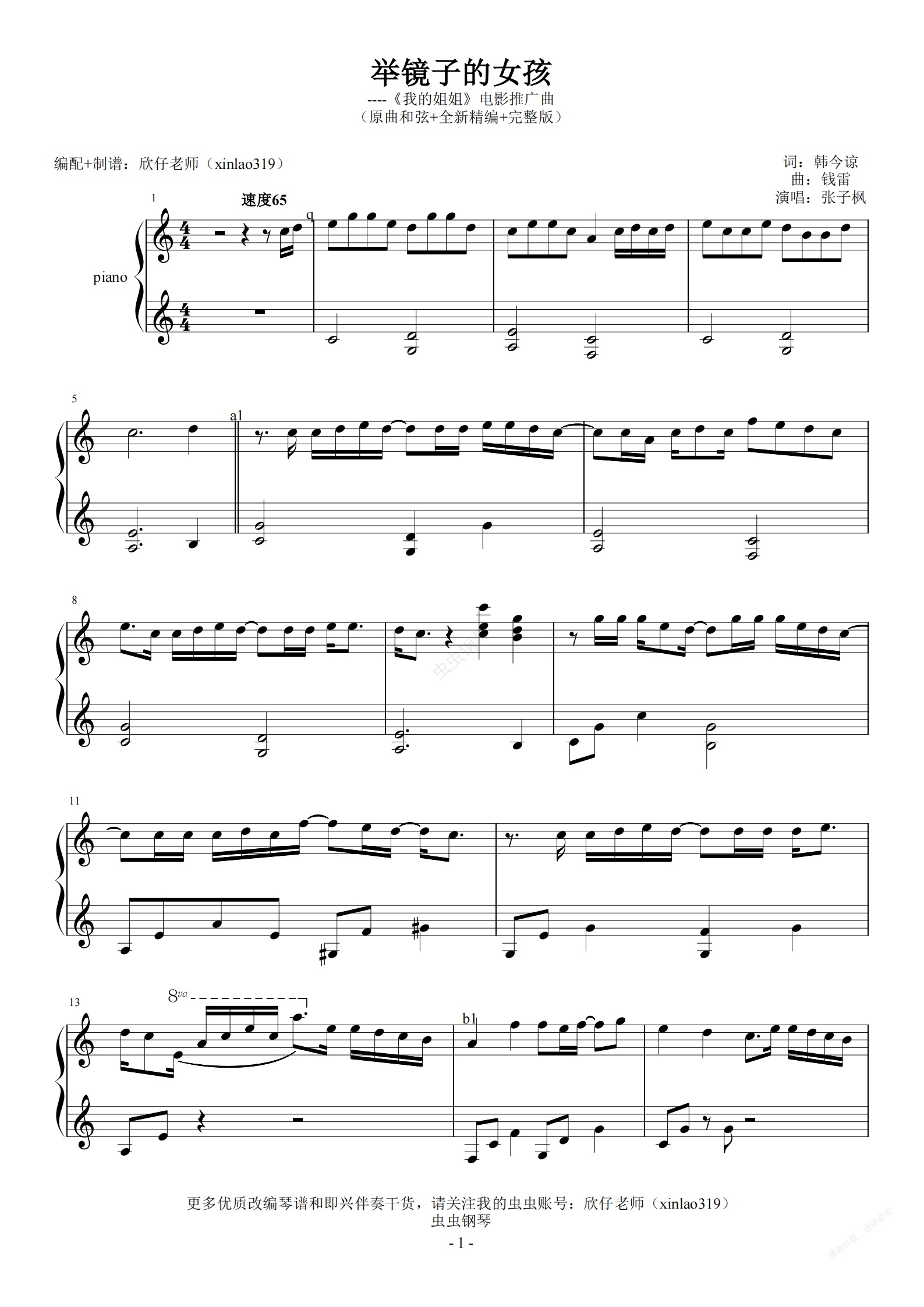 钢琴谱:张子枫-C《举镜子的女孩》-《我的姐姐》推广曲(原曲和弦+全新精编+完整版)
