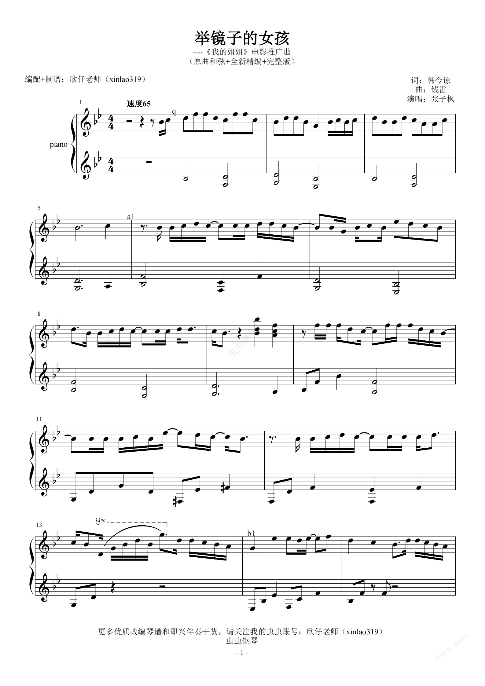 钢琴谱:张子枫-降B《举镜子的女孩》《我的姐姐》电影推广曲(原曲和弦+全新精编+完整版)